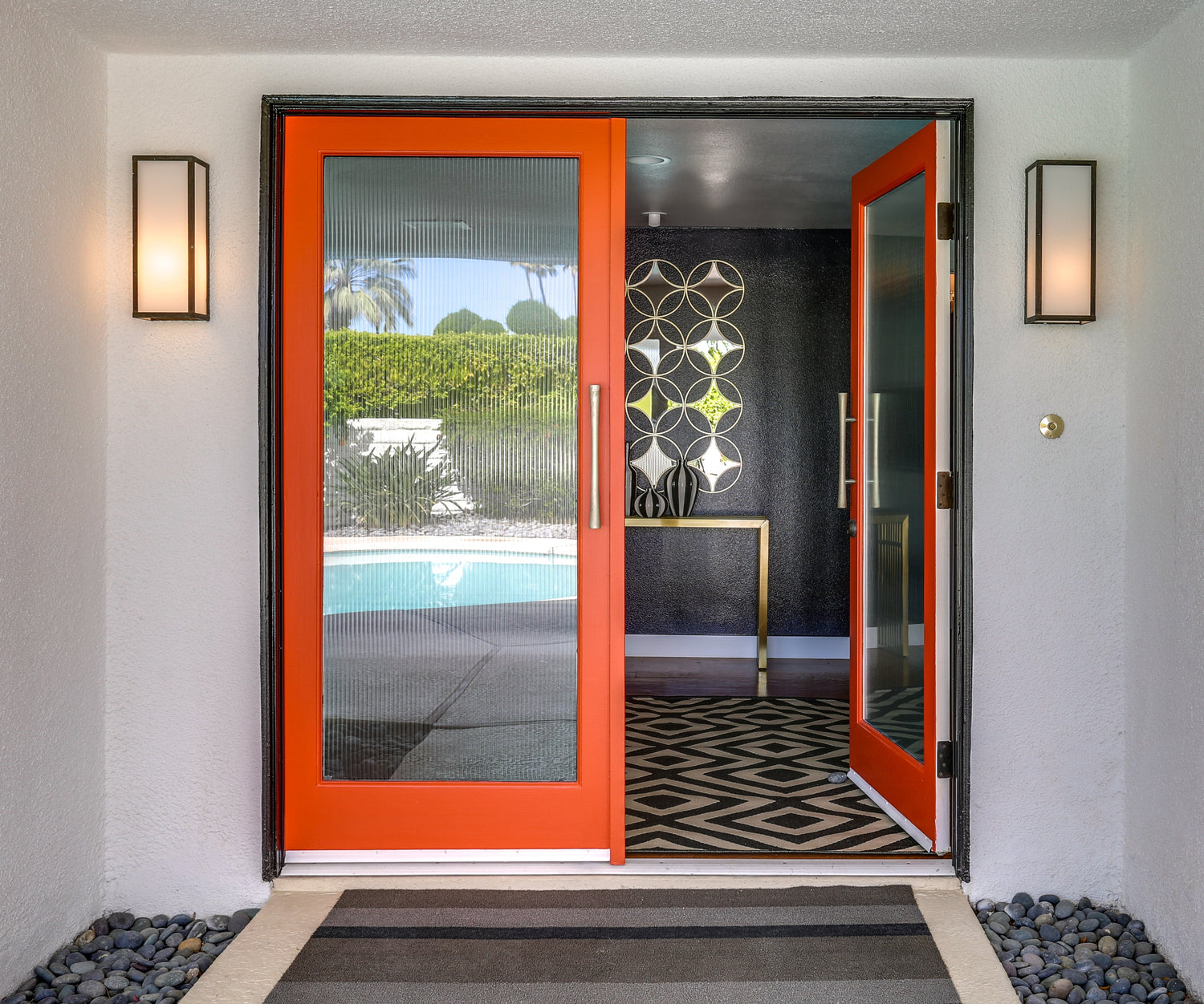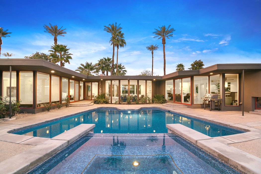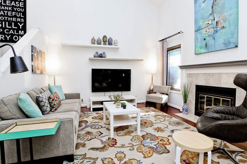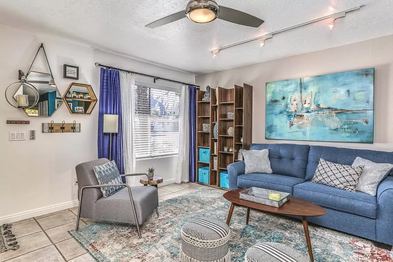 This elegant living room blends deep emerald walls, a velvet sofa, and...