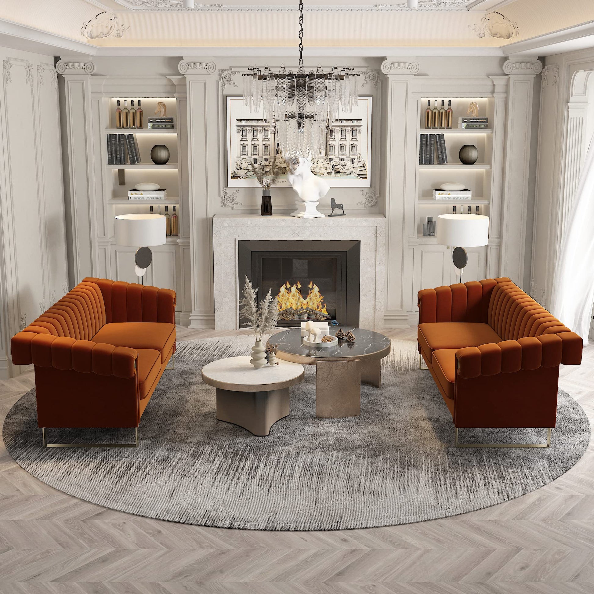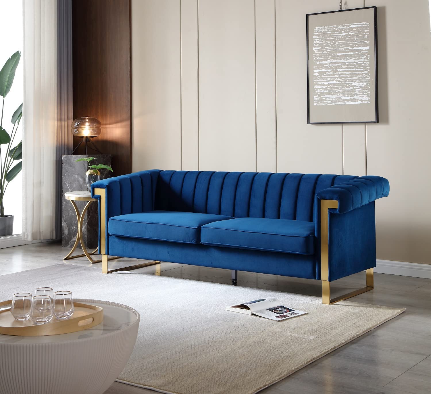 The blend of spring and sponge foam gives you the perfect balance to rest your mind, body and soul to reenergize for any work or task. The whole package includes a vibrant coloured velvet upholstered sofa with high-grade stainless steel electroplated brushed metal feet of the sofa make them very comfortable to sit on. The metal accents go through the arm-rests to provide even more stability to the sofa and the arm-rest. The length of the sofa is 83.86" while the width and height are 30.71" and 30.51" respectively. The sofa weighs around 93 pounds making them easy to move around. The velvet upholstery on sofa comes in multiple colours.