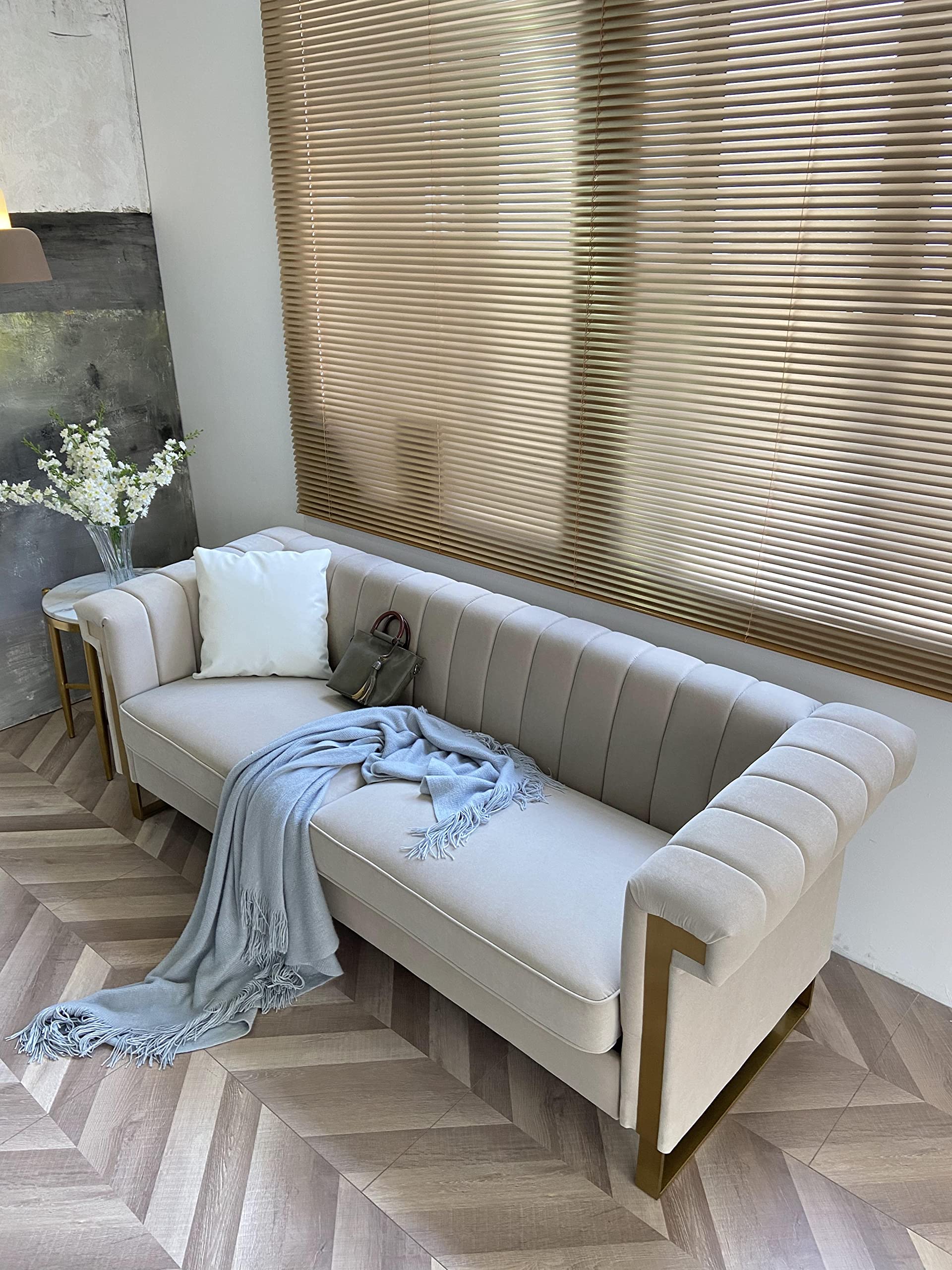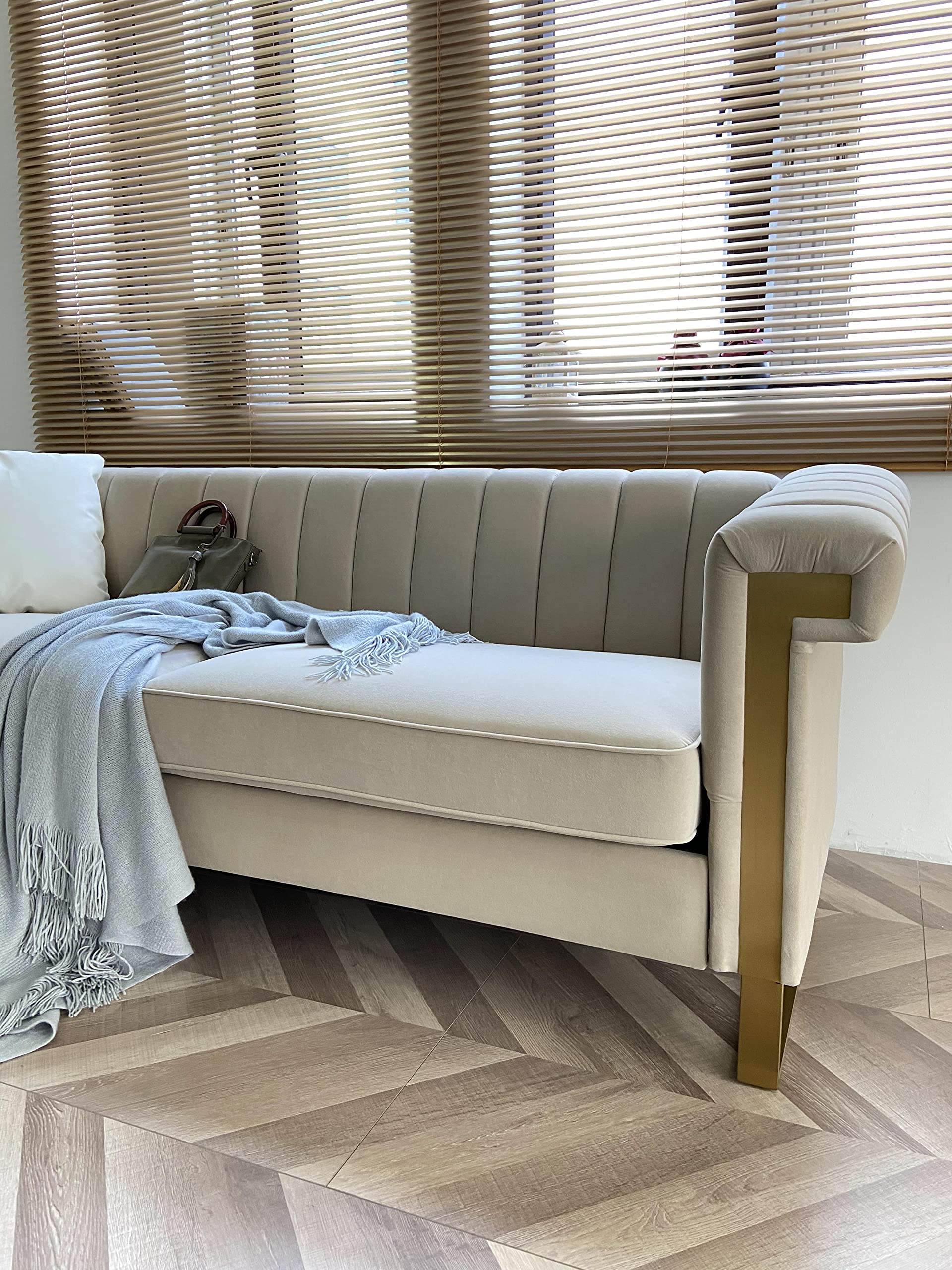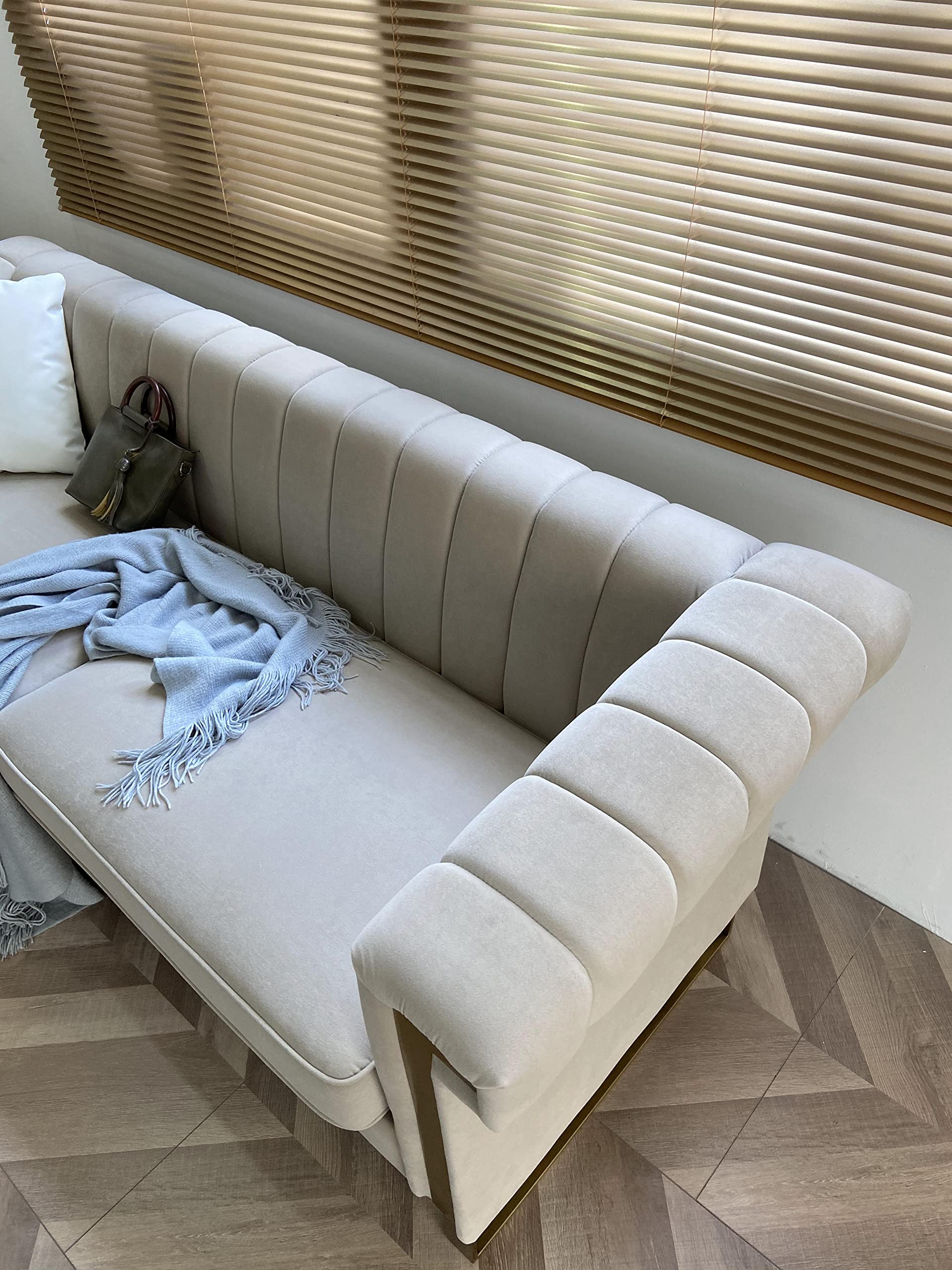 - 【VELVET UPHOLSTERY】: The 3-seater sofa is upholstered with niche velvet fabric used in designing high end clothes and luxury car seats giving it a modern and gorgeous look. The velvet fabric is very soft and breathable, while it also has a high tensile strength preventing tears on the fabric. The sofa is perfect for living room, bedroom, study, apartment and more. The sofa will make you feel comfortable helping you relax and exhume all the stress from your body.
