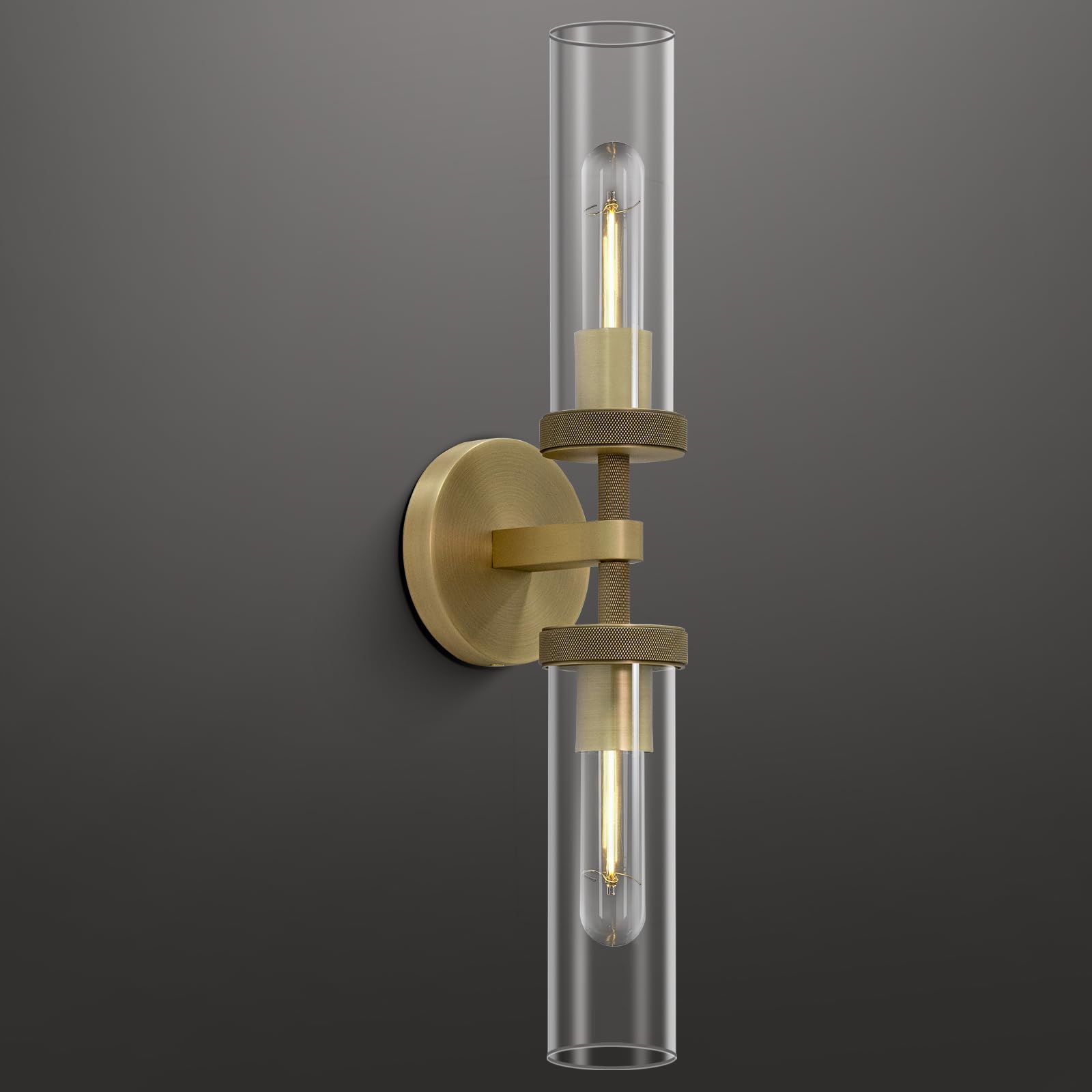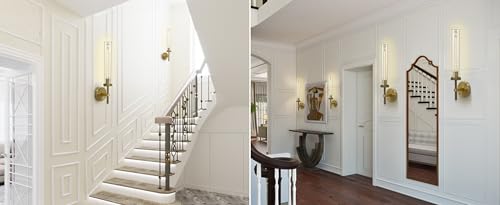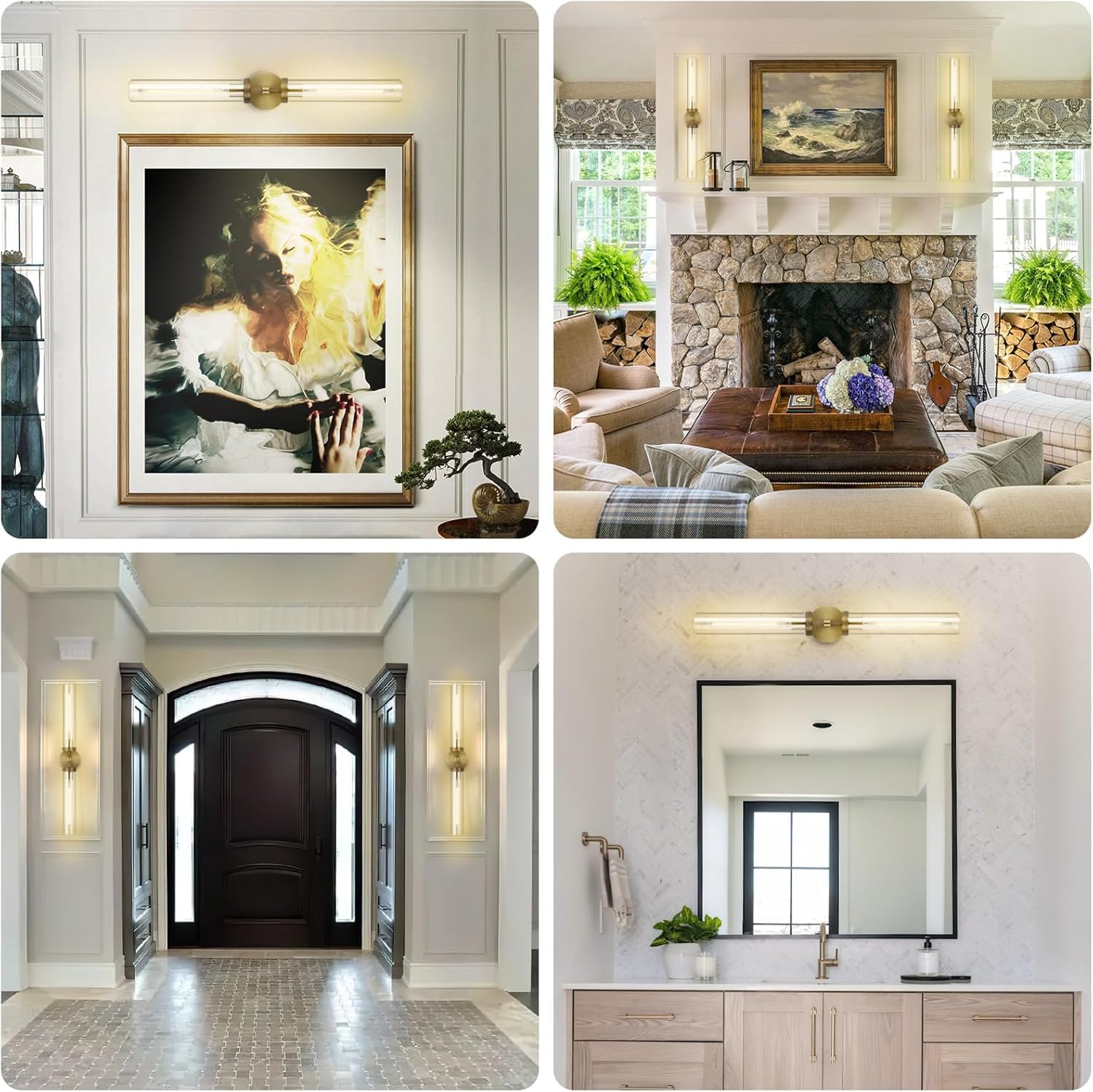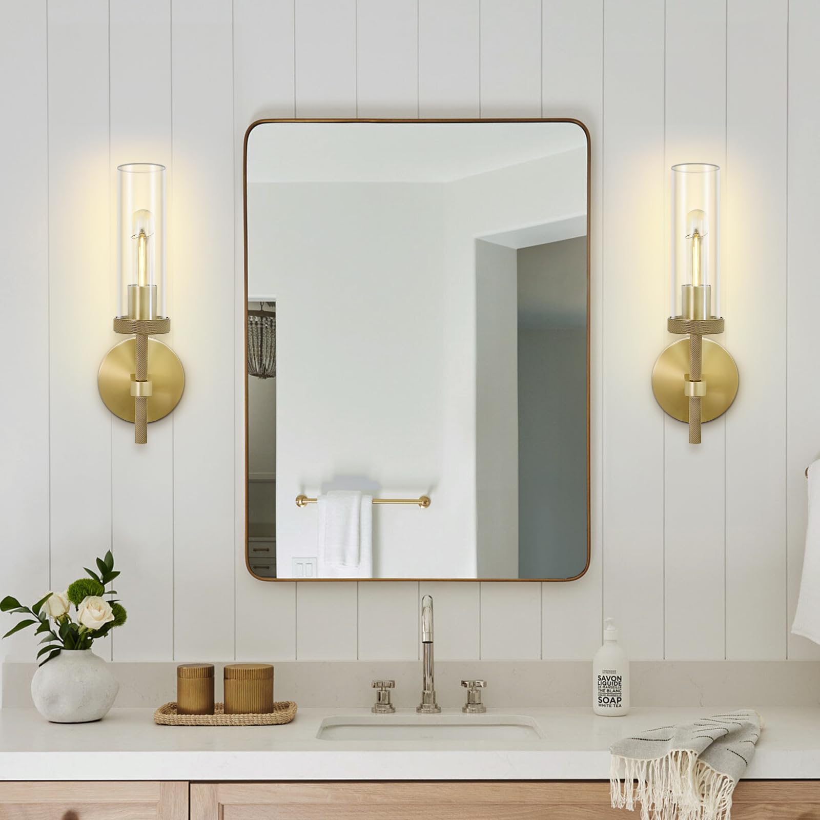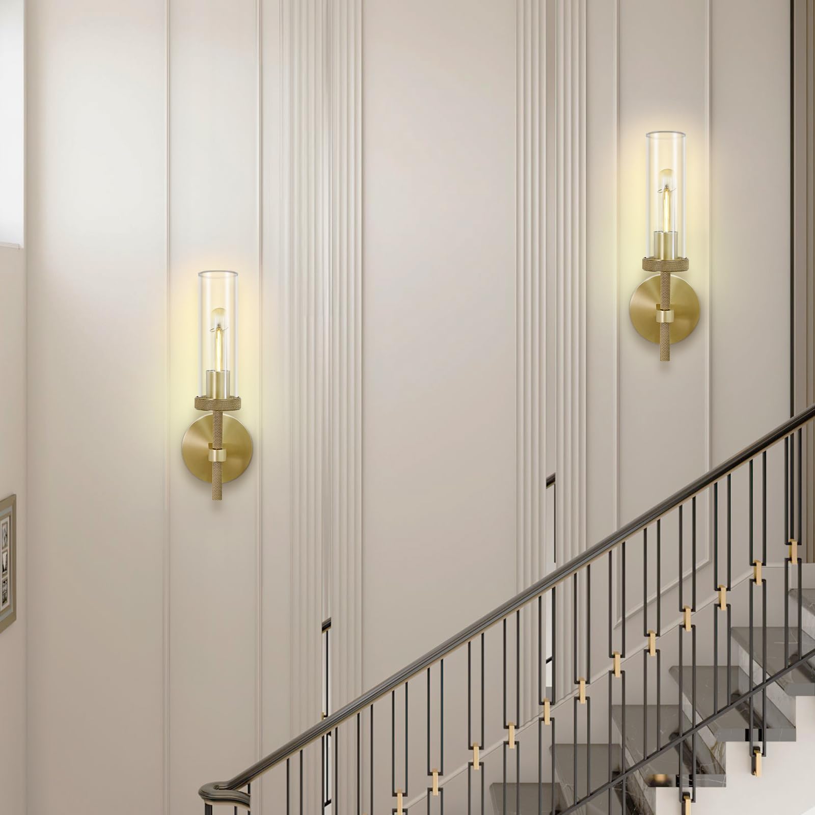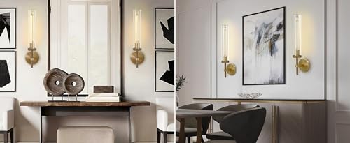 Brass Wall Sconces Set of Two, 19" Knurled Gold Sconces Wall Lighting, Tube Glass Bathroom Sconces Wall Lights for Bedroom Living Room Vanity Sconce Wall Lamp for Hallway, Staircase
