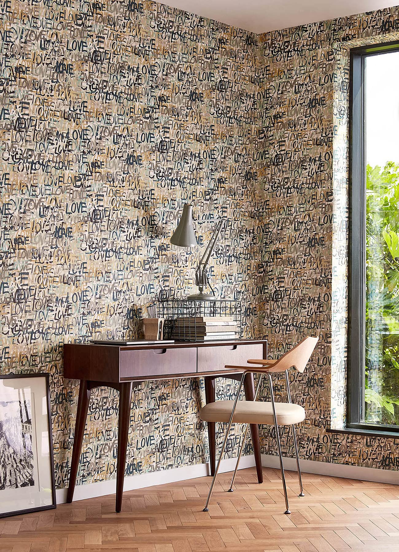 Enjoy street art styling with a little extra TLC with this graphic wallpaper! The word love appears hundreds of times, overlapping in an array of yellow, orange, pink, red, blue and teal paints. Indio is an unpasted, non woven wallpaper.