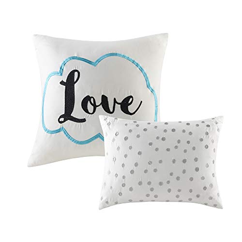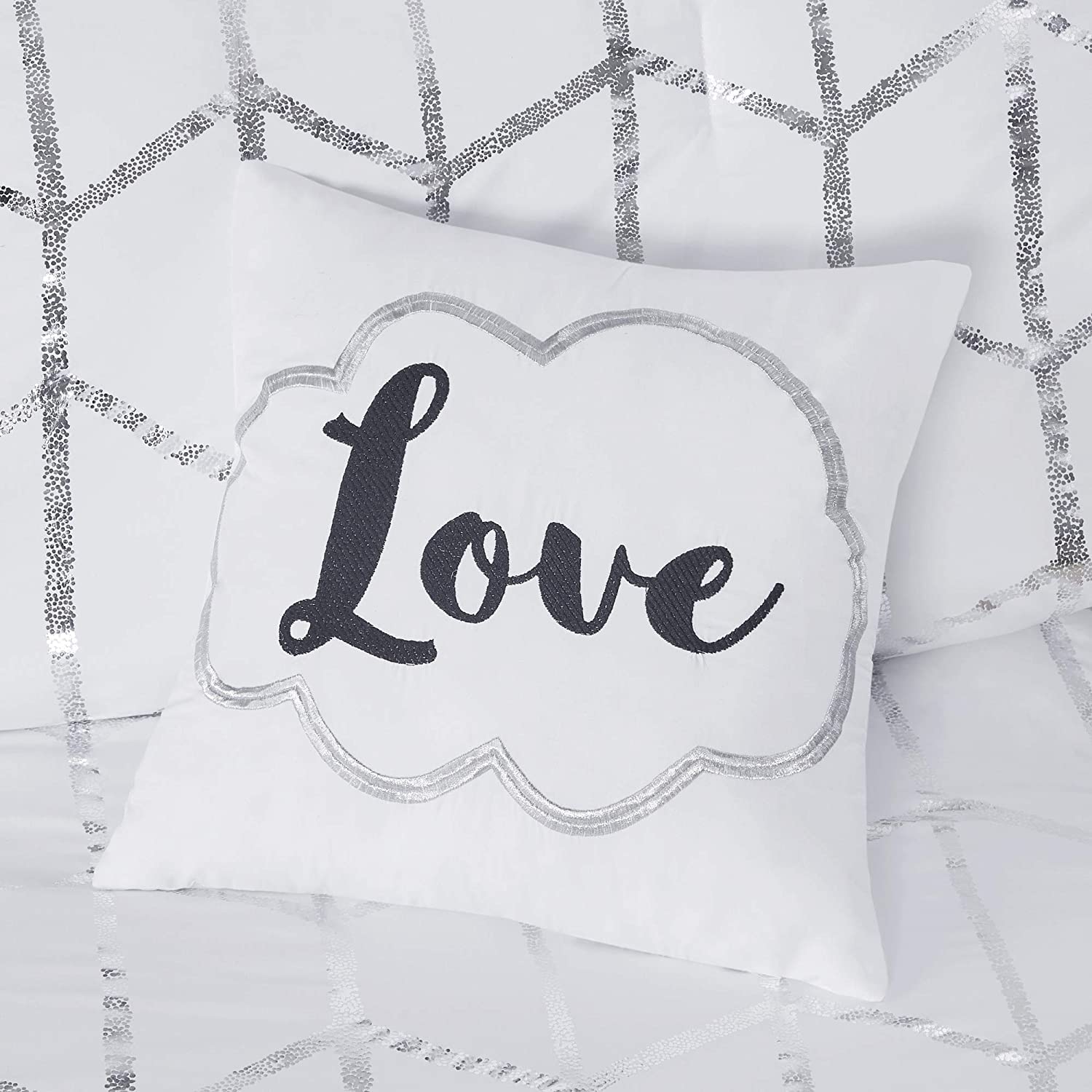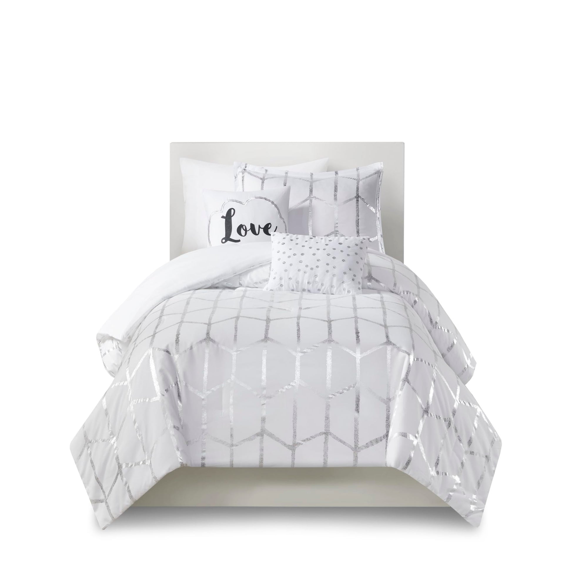 Freshen up your bedroom with the enchanting style of Intelligent Design’s Raina Comforter Set. The stunning comforter flaunts a geometric, metallic silver print against a deep grey ground for a fun and eye-catching look. Matching sham(s) echo the design seen on top of the bed to pull the entire ensemble together. 2 embroidered decorative pillows with typography and metallic, complete this fabulous comforter set.