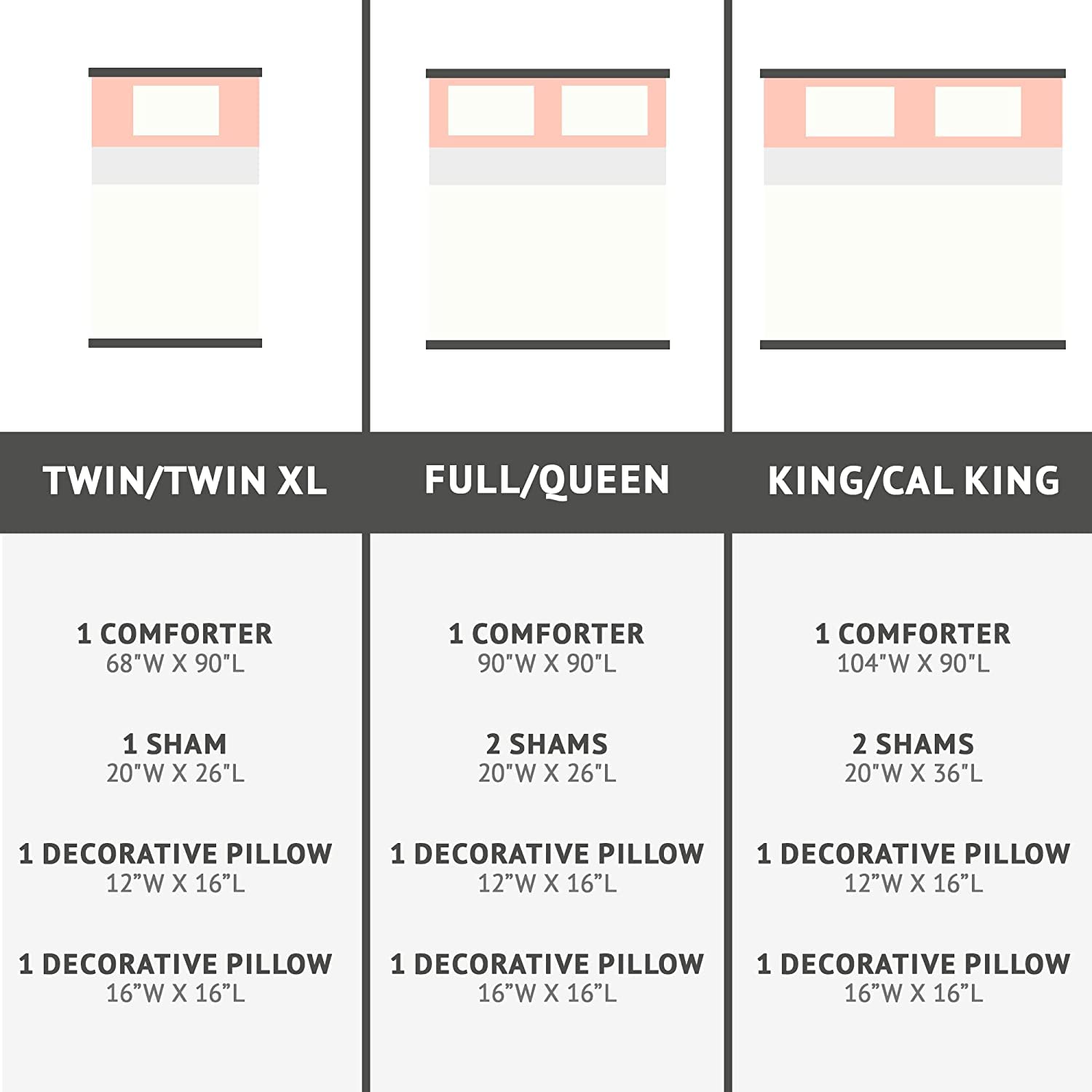 - Geometric Comforter Set: (1) comforter 90” x 90”, (2) shams 20” x 26”, (2) decorative pillows 12” x 16” and 16” x 16”