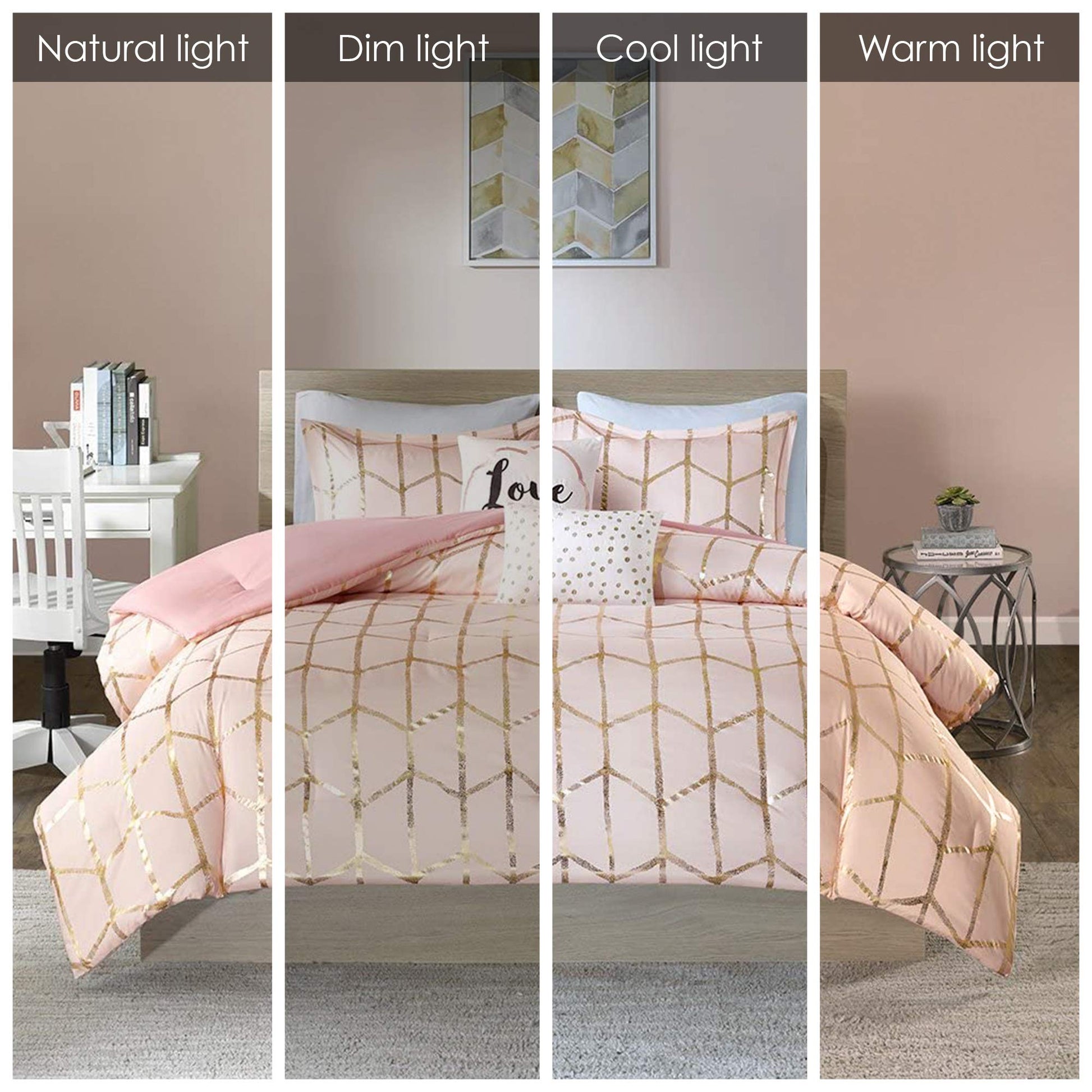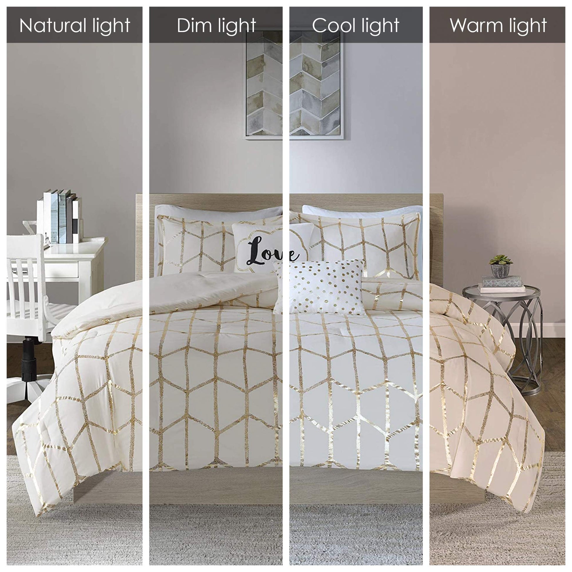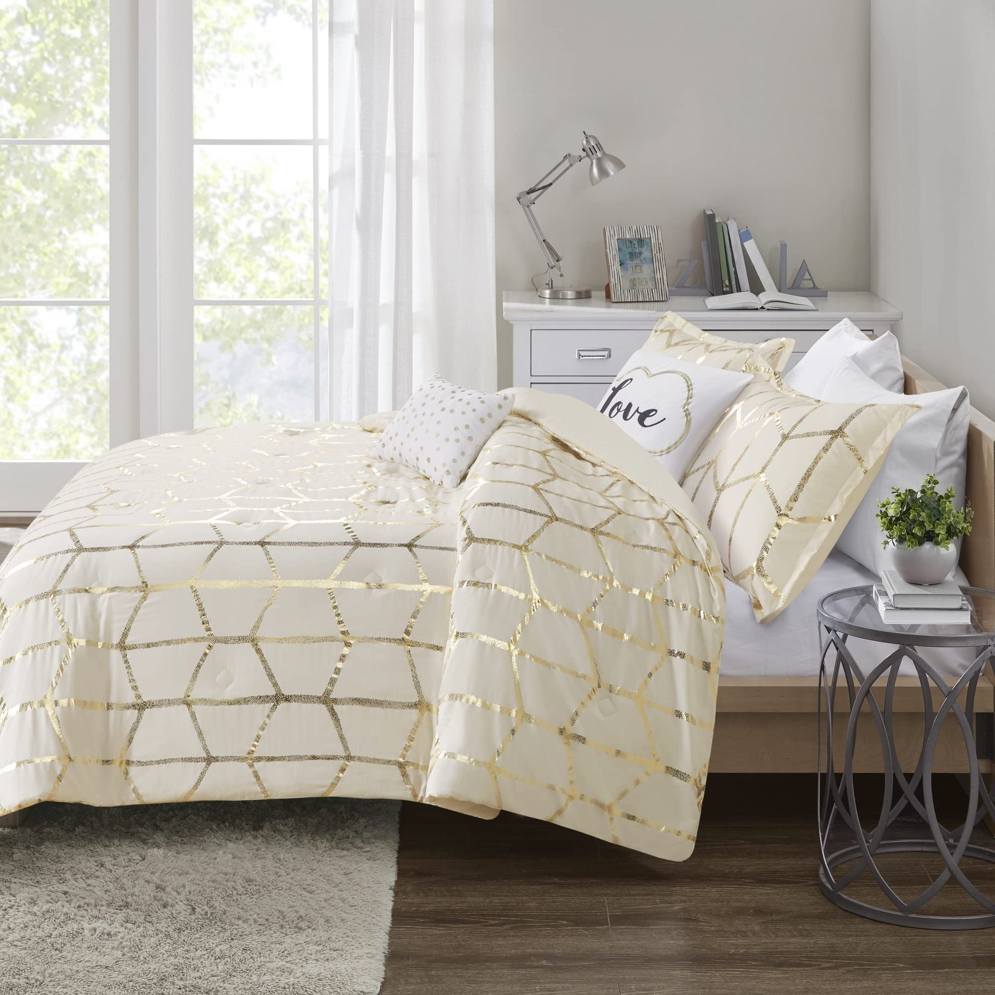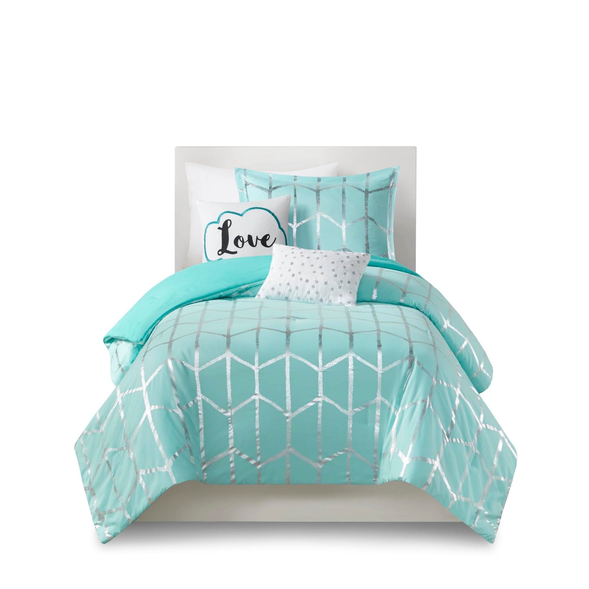 - Modern Comforter Set: Freshen up your home with the enchanting style of Intelligent Design’s Raina bedroom set Queen Bedding. The stunning metallic comforter set flaunts a trendy geometric print with a fun and striking contrast