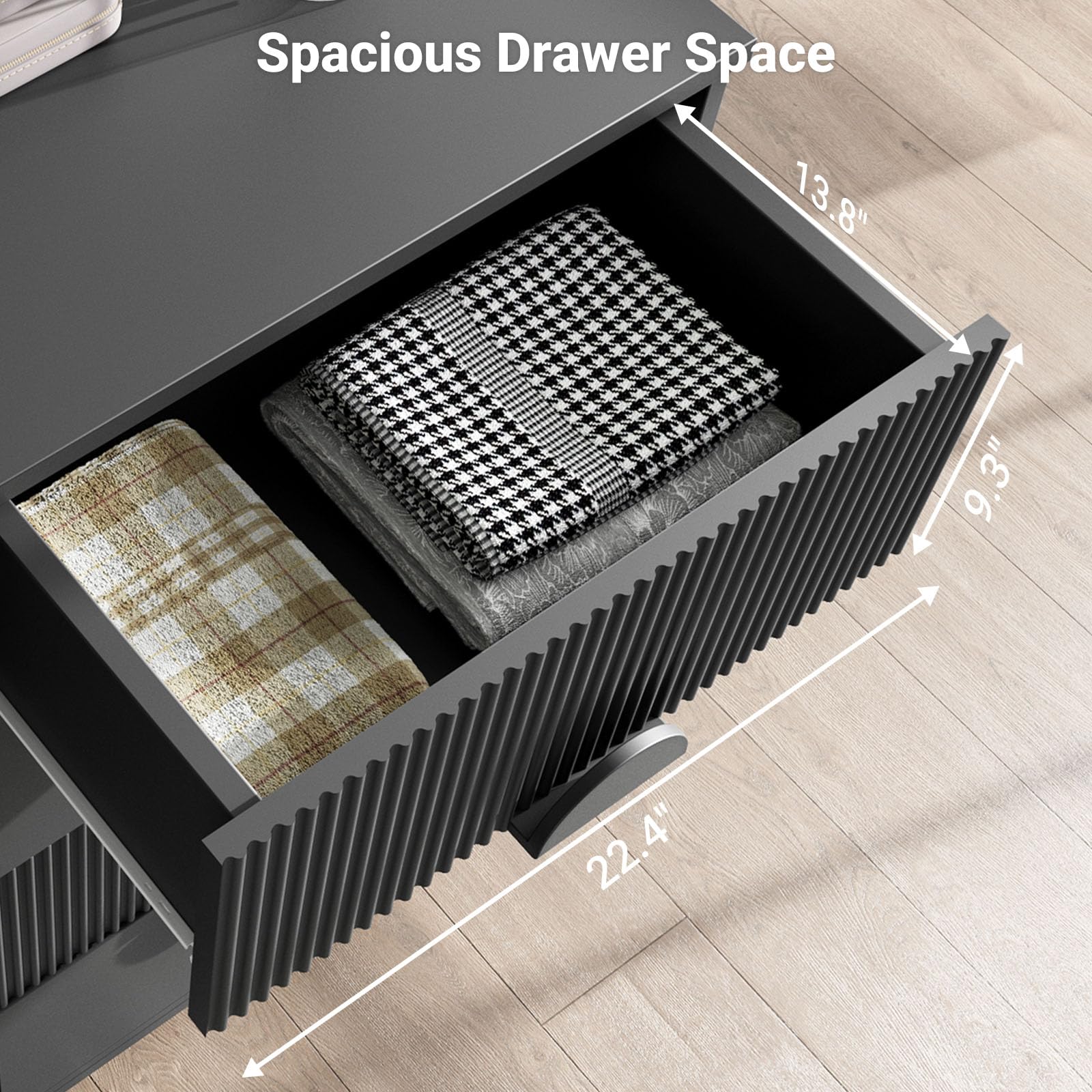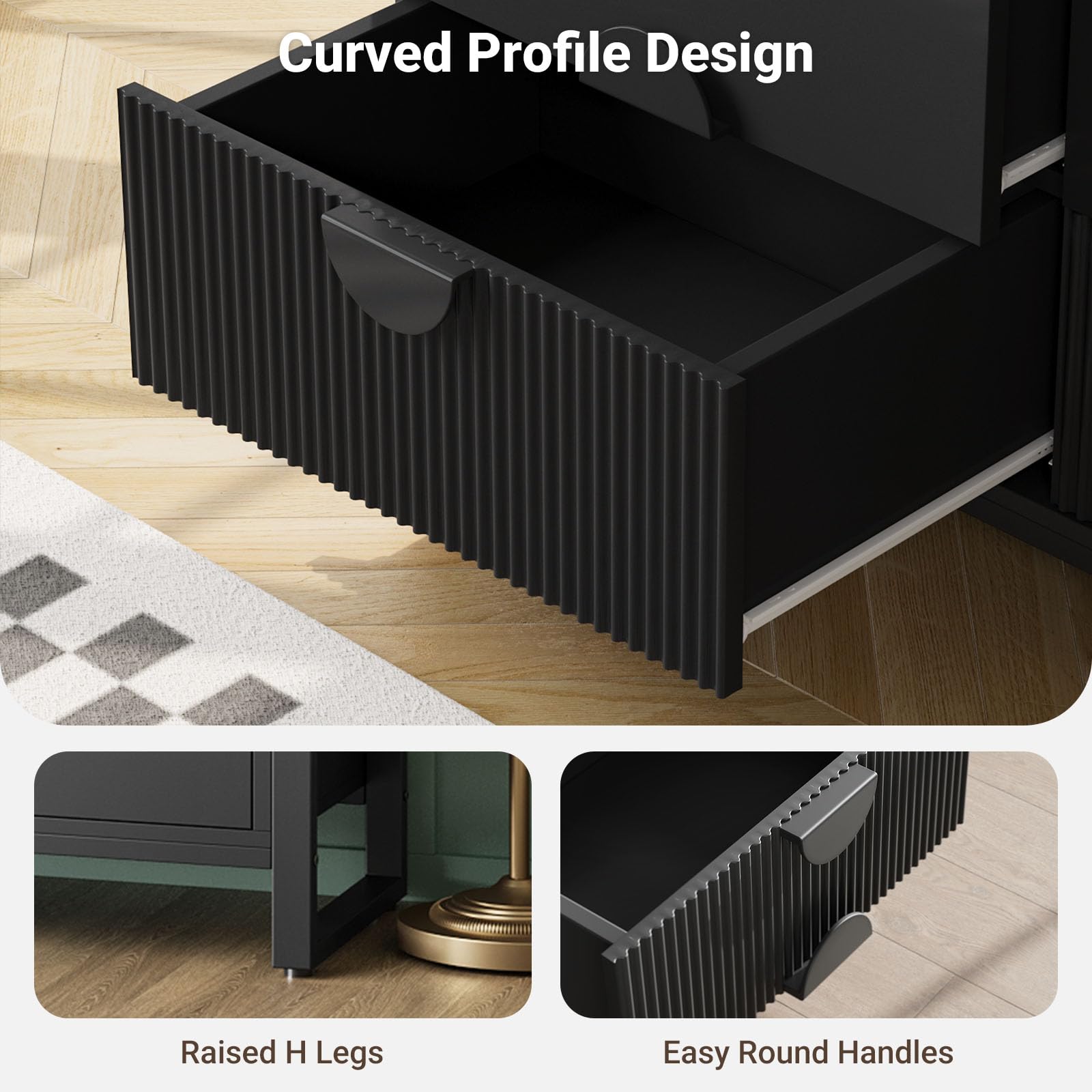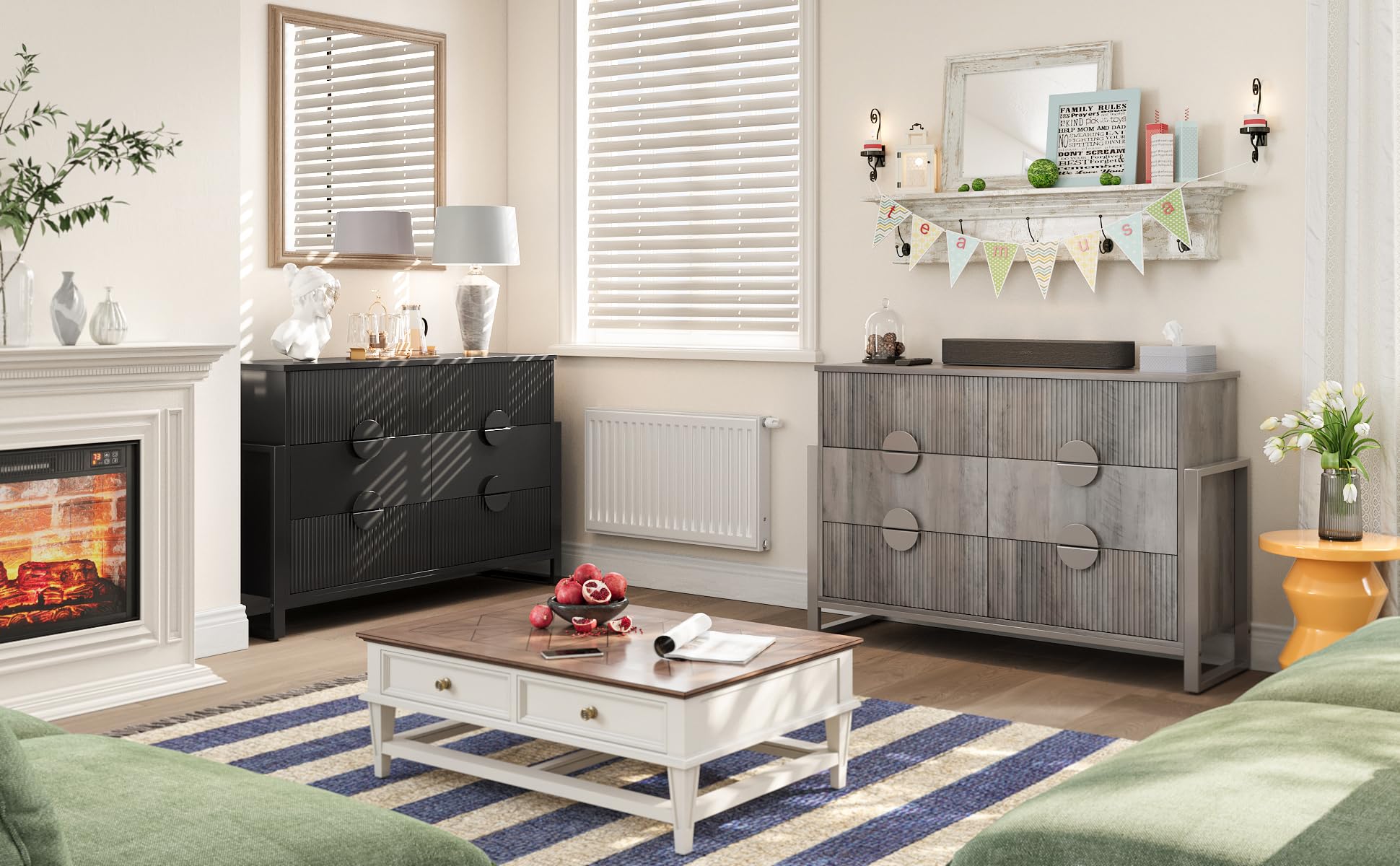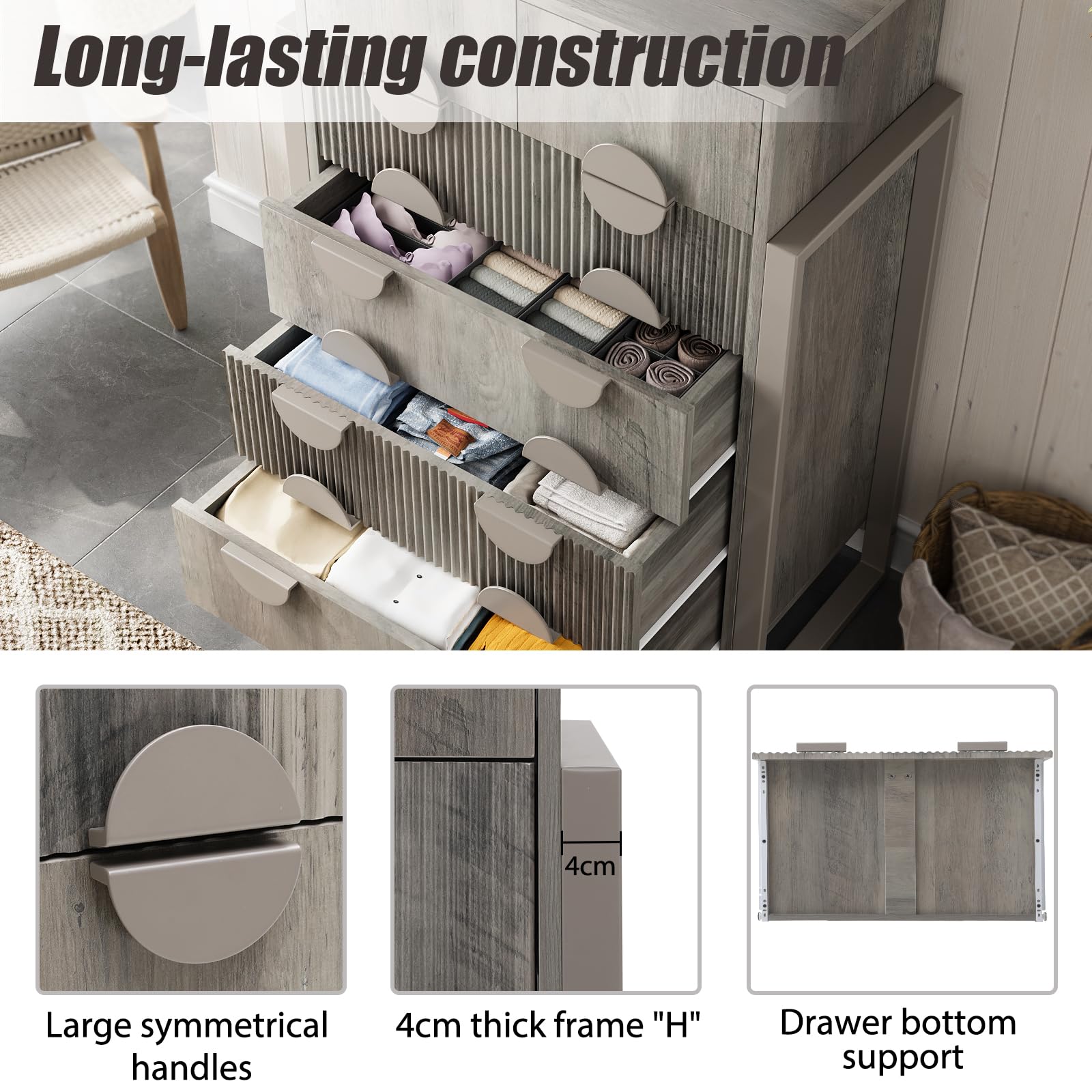 - 【Timeless Elegance Meets Modern Chic】The dresser showcases a distinctive wave-like fluted panel that significantly enhances its texture and spatial presence, making it a truly outstanding piece. Its wide round metal handle and raised thick frame "H" legs infuse a contemporary vibe, while also ensuring a safe environment for children,and won’t snag your sleeves.