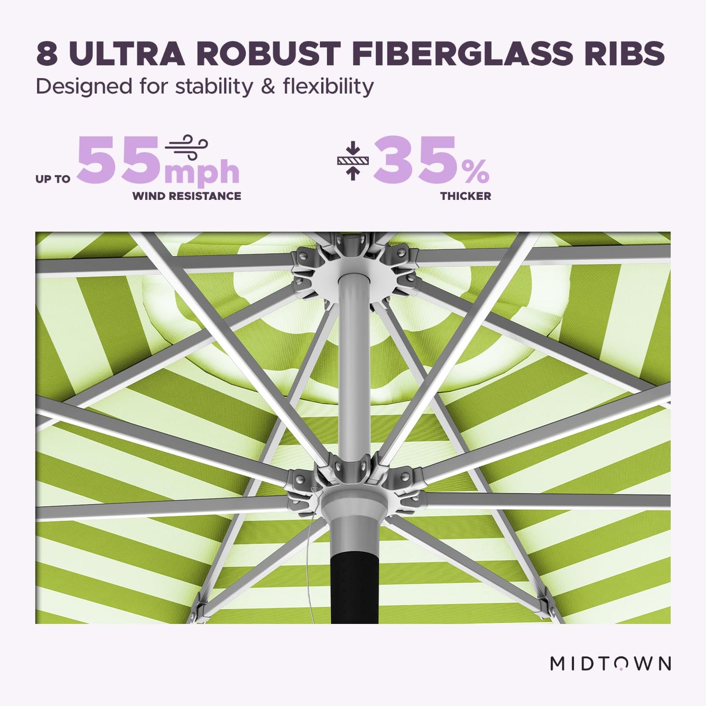 - [ WHAT YOU GET ]: 9 Feet Aluminum Patio Umbrella With Fiberglass Ribs in Terylast Apple Stripes. Our outdoor umbrellas for patio can cover a table for 6-8 chairs depending of the shape. To avoid defects and replacements, this market umbrella is made of a FULL ALUMINUM this outdoor patio umbrella unlike other low end patio umbrellas is made of steel and iron. Aluminum is completely RUSTPROOF and is also powder coated for extra protection.