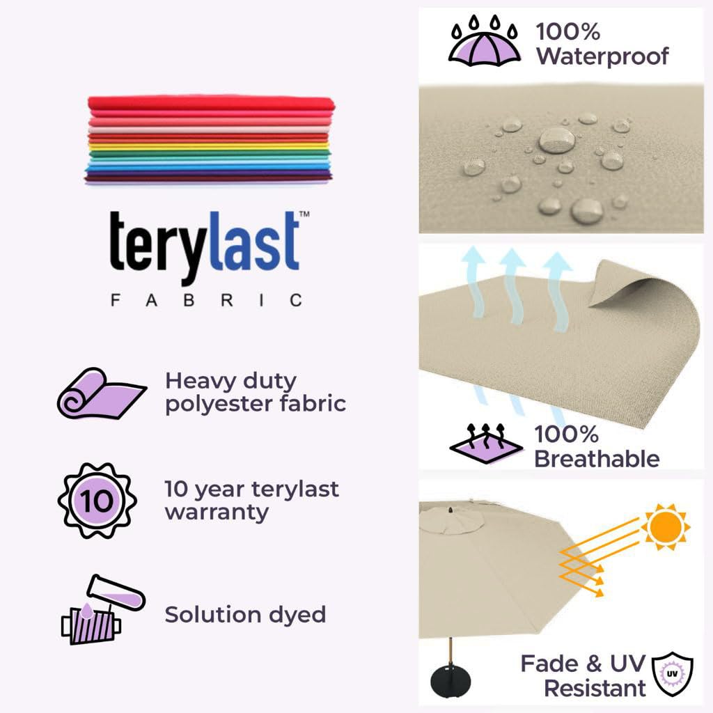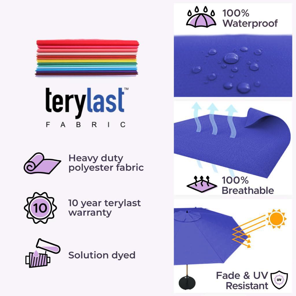 - [ INTELLIGENT DESIGN ]: Aluminum Pole: We don’t use rusting iron or steel! This pool umbrella has a thick 2.5mm wall that is rustproof and weather resistant that will provide peace of mind even under rainy weather. Both Terylast or Sunbrella fabrics are waterproof and solution dyed for optimal fade resistance under the beaming sun.