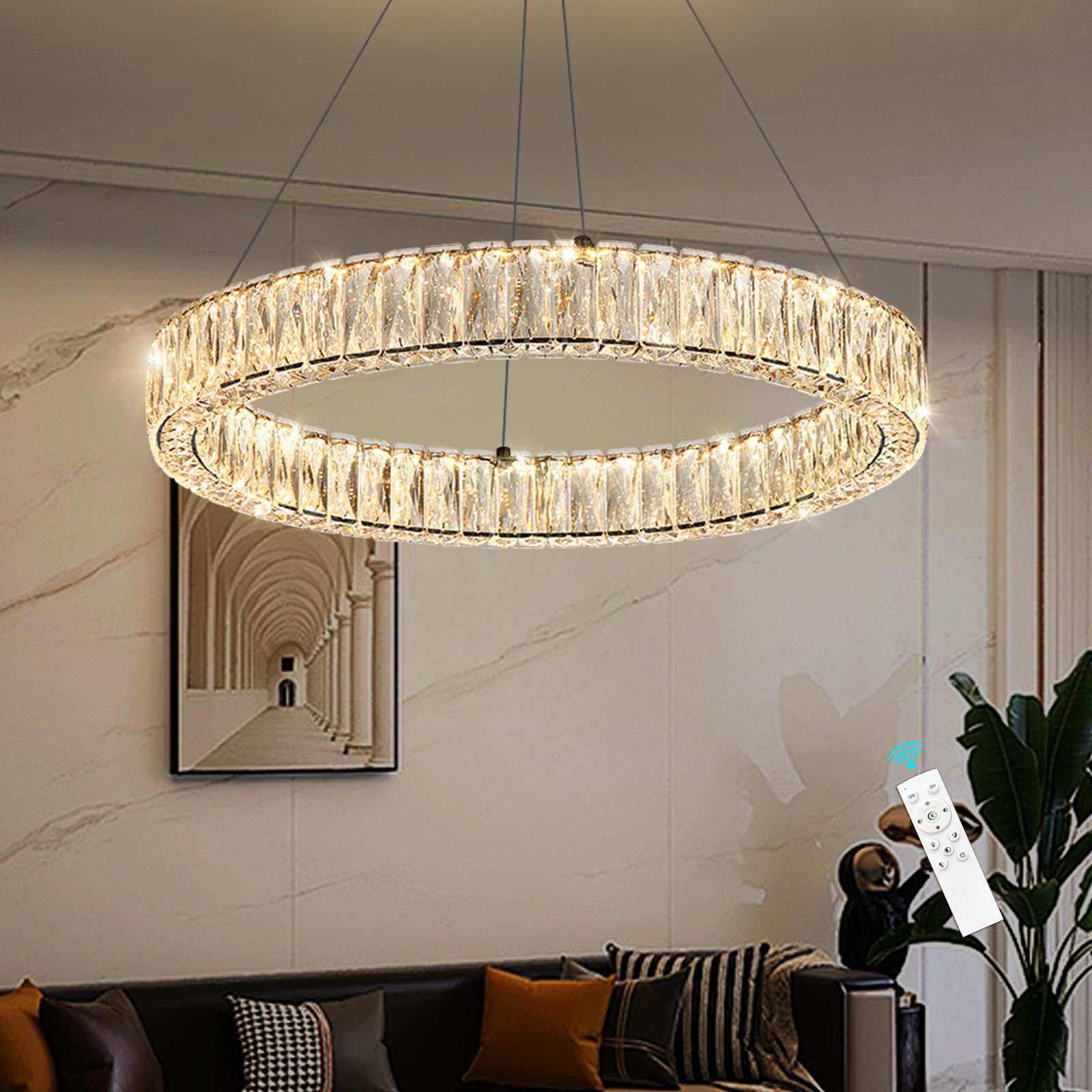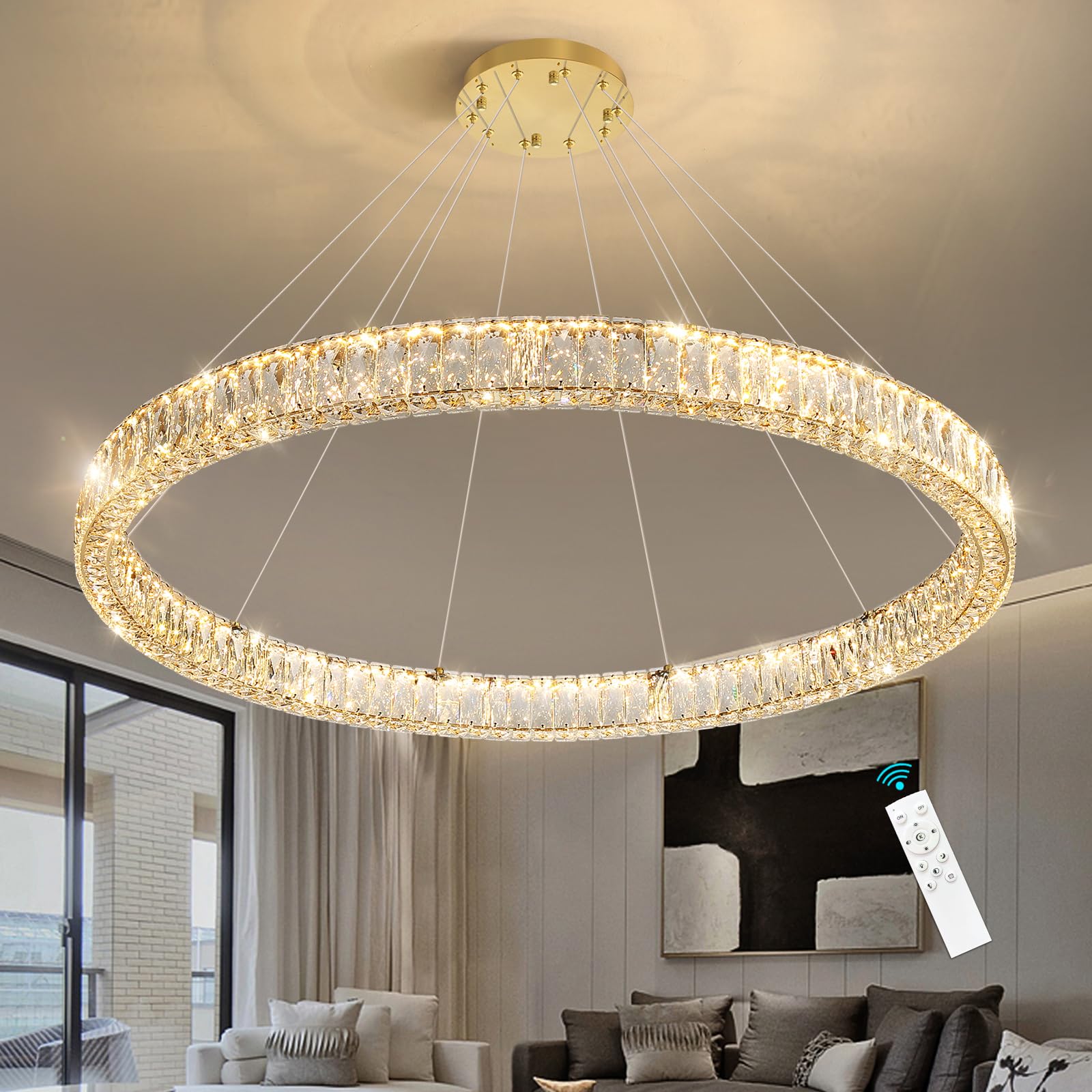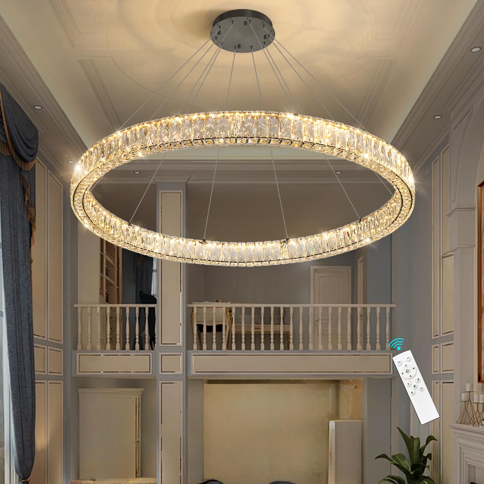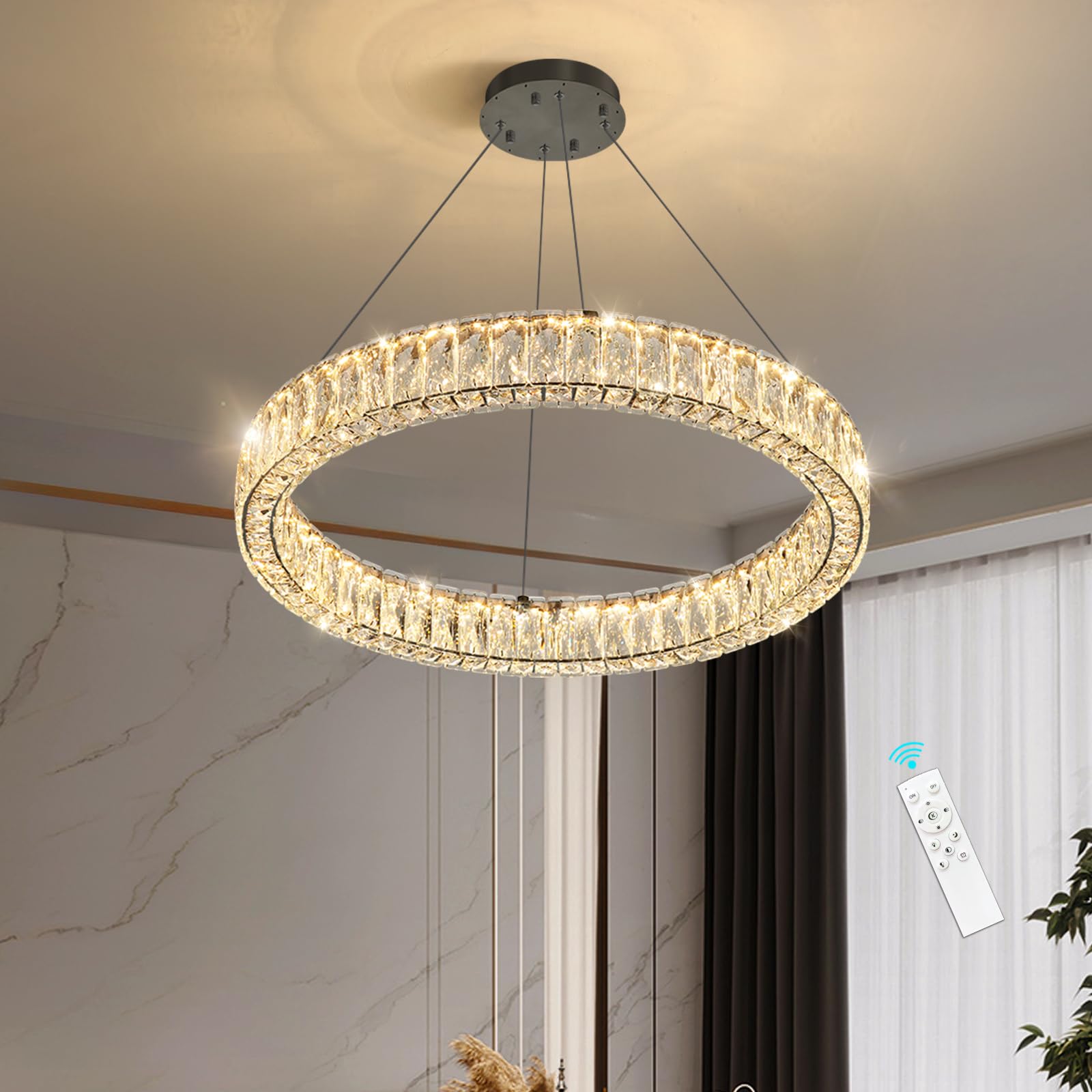 Transform your space with this stunning modern crystal chandelier that combines contemporary design with timeless elegance. The sleek ring design features sparkling crystal elements that create a captivating play of light and shadow. This versatile pendant light comes with adjustable height capabilities, allowing you to achieve the perfect positioning for your room. The dimmable LED technology lets you set the perfect ambiance, from bright task lighting to soft, atmospheric glow. Finished in sophisticated black, this fixture makes a striking statement whether suspended above a dining table, illuminating a living room, or adding glamour to a bedroom. The chandelier's modern ring design offers both dramatic visual impact and practical illumination, making it an ideal choice for those seeking to blend luxury with contemporary style.