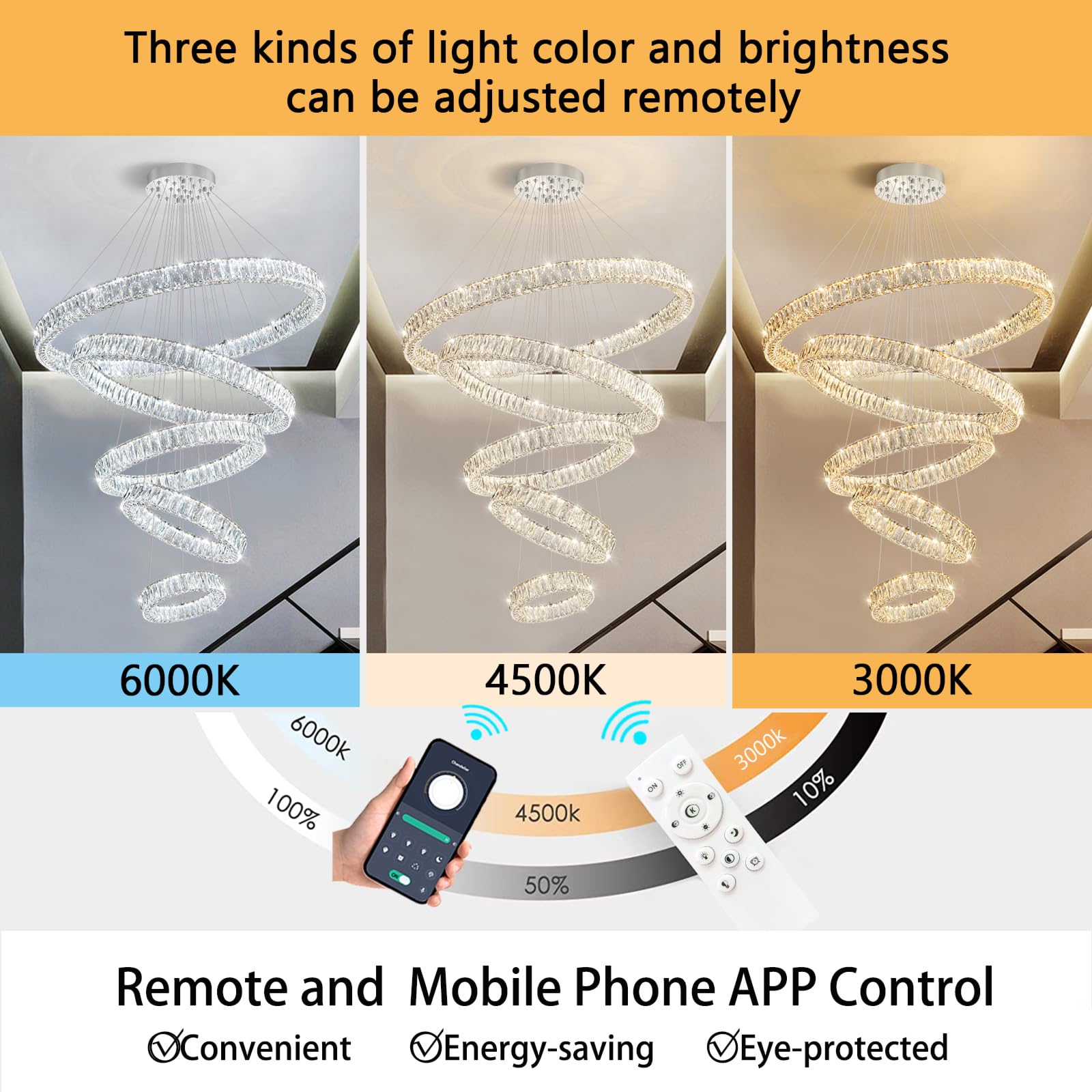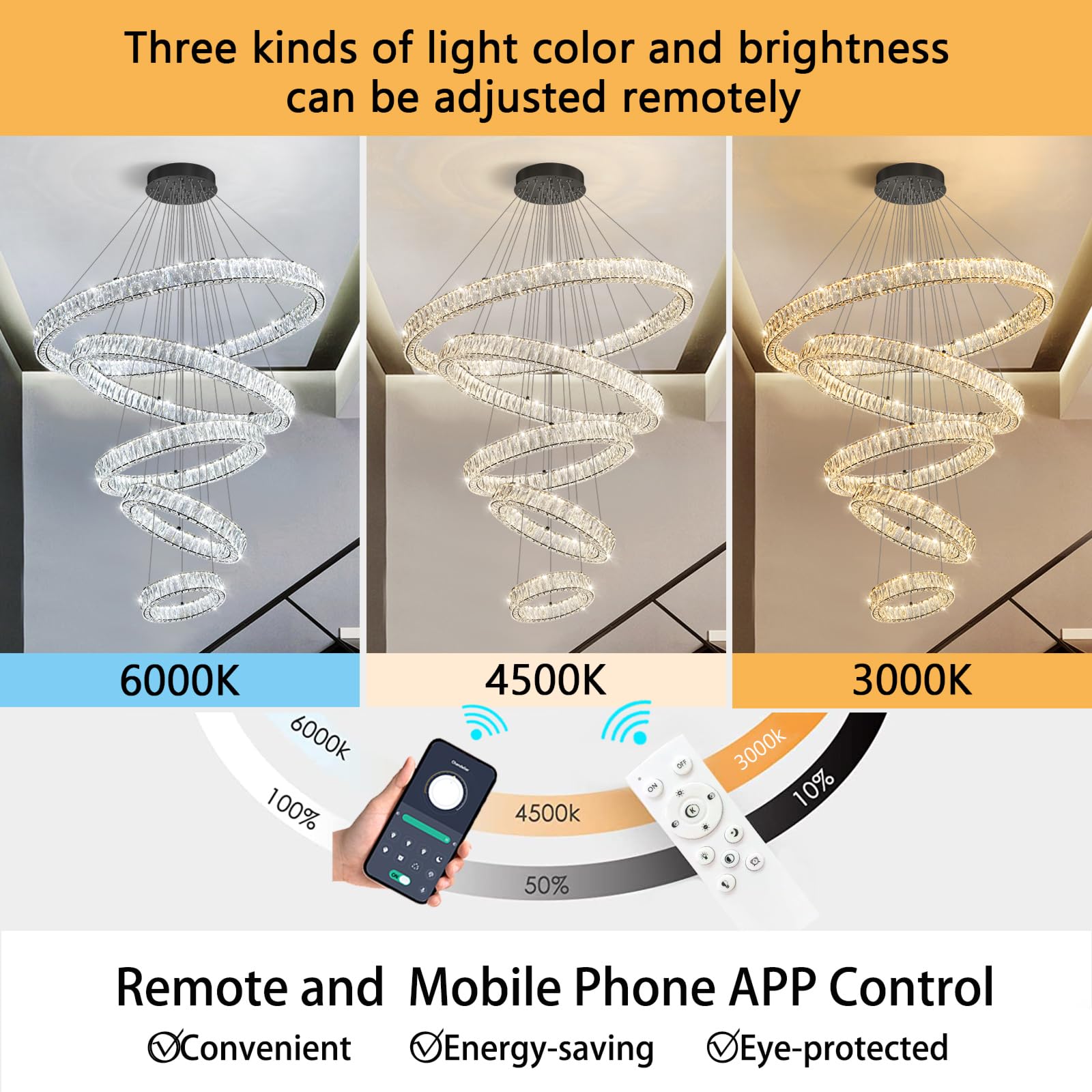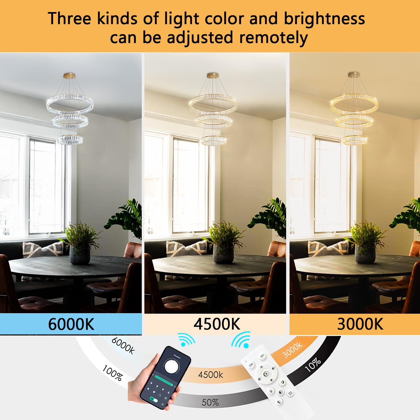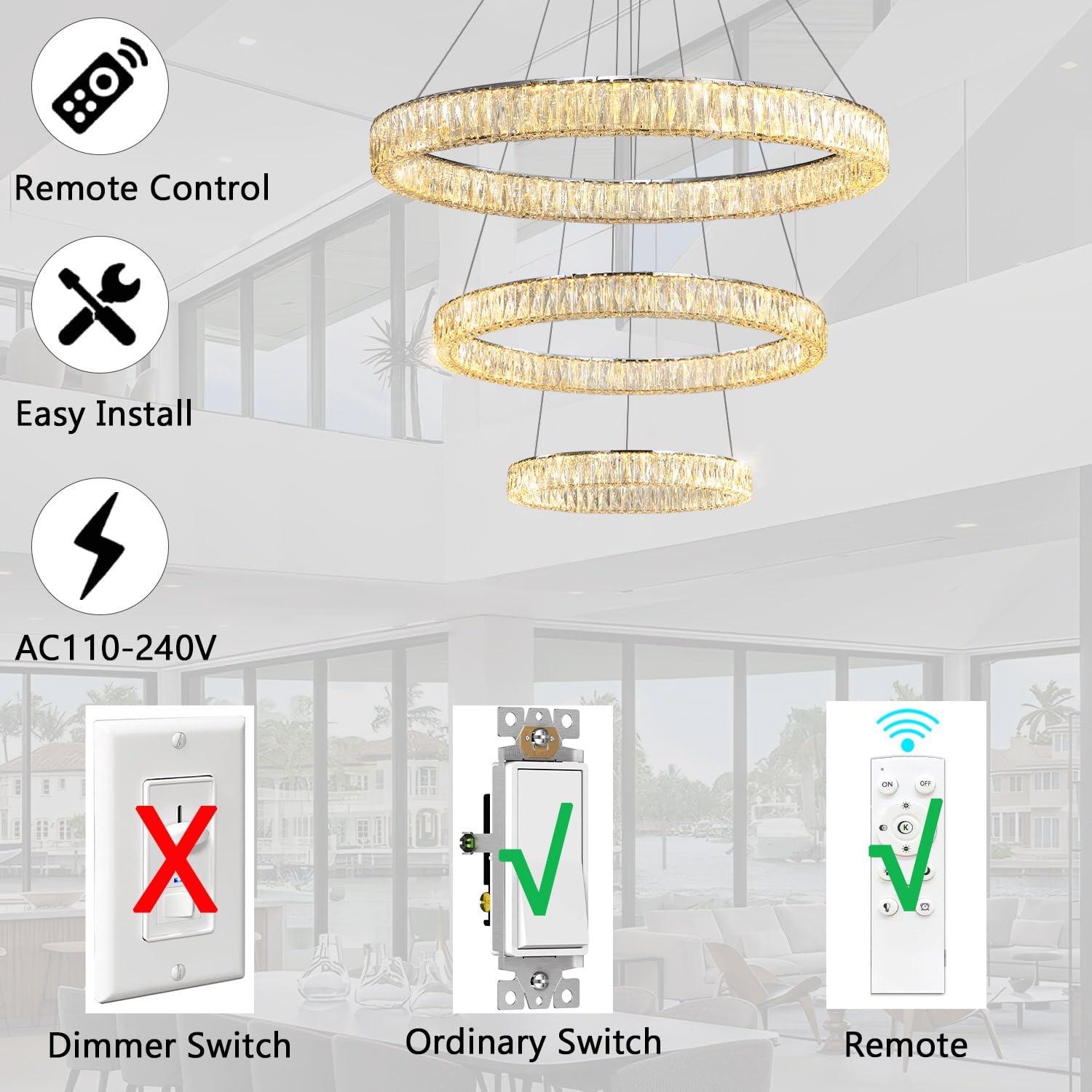 - Remote Dimmable Chandeliers - The chandelier can be used with voltages in the range of AC 110V to 240V. Set lighting color from warm light 2700K to day light 6000K, and dimming dark or bright any time (Note: Chandelier itself has a dimmer, Do not use with any dimming system or dimmer switch)