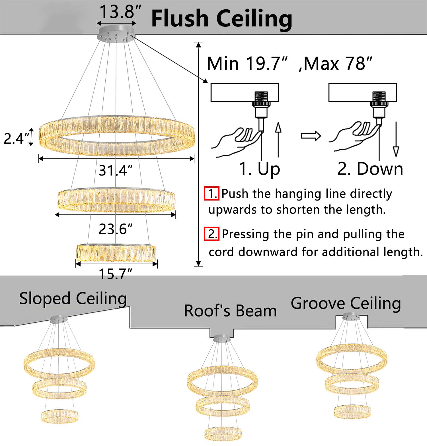 - Chandelier Details - Ring Width 24", easy to adjust hanging wire length min 7.8", max 78". easily mounted on a variety of ceilings. Weight 20 lbs (about 9.2kg), 20 Watts LED, 1600 Lumens