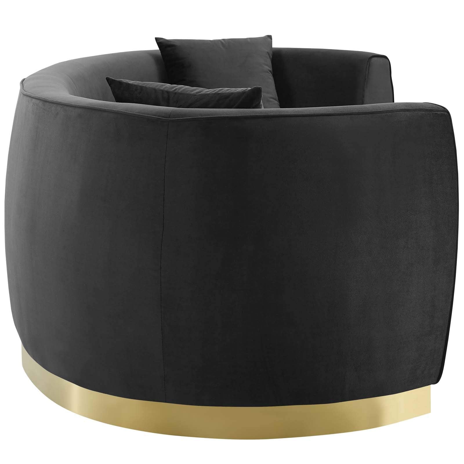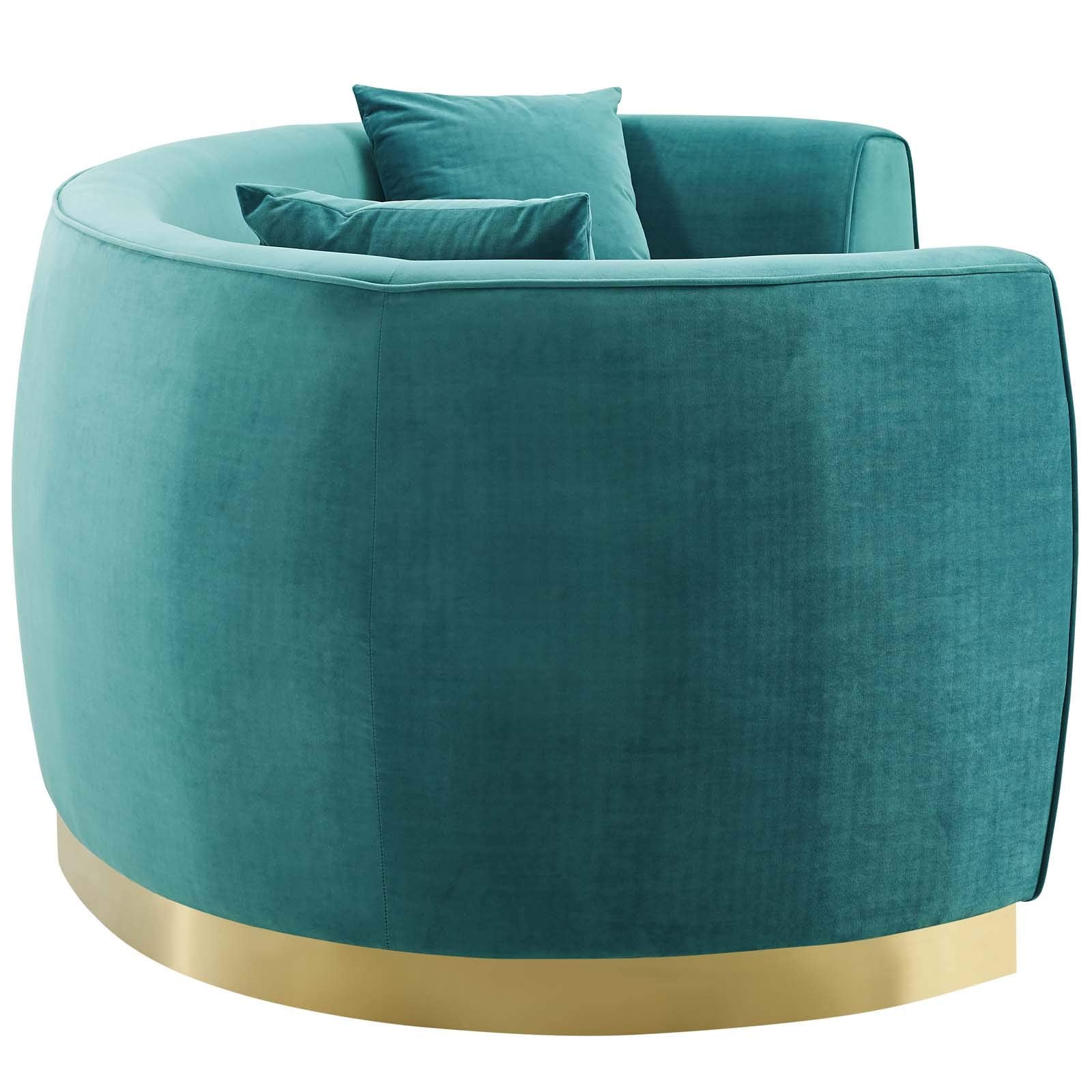 Let glamorous vintage style take the spotlight with the Resolute Curved Sofa. Introduce a luxurious seating experience with a graceful curved shape and soft, stain-resistant performance velvet upholstery for an irresistible focal point to any living room, lounge room, home office, and other seating areas. Resolute features dense foam padding, a removable seat cushion with a removable cover, a gold stainless steel base, and individually wrapped coil spring system for an elegant piece that is supremely comfortable and supportive. This lavish velvet living room sofa couch comes complete with two accent pillows that perfectly complement Resolute's rich hue. Maximum Weight Capacity: 900 lbs. Comes Fully Assembled.