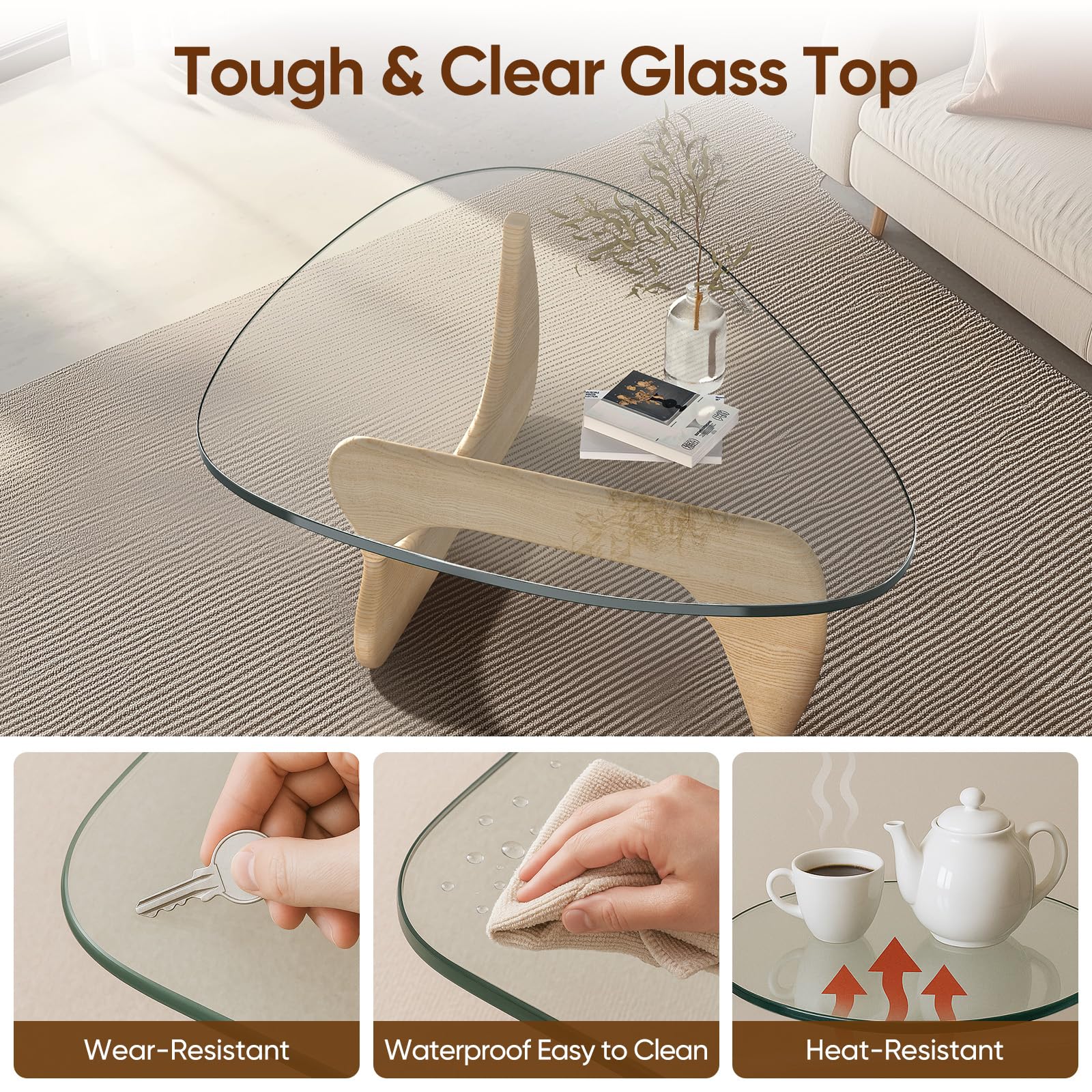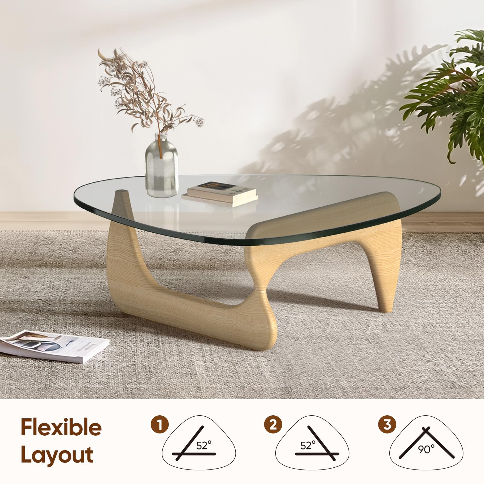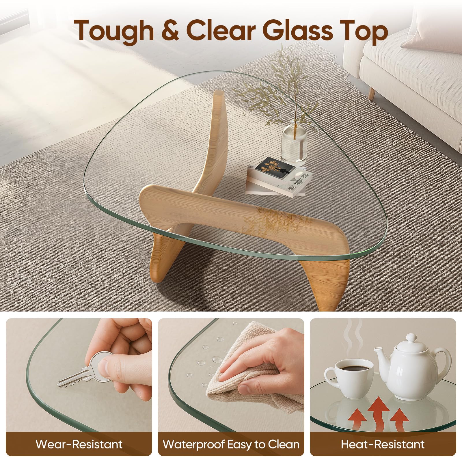 Noguchi Coffee Table – Mid-Century Modern Triangle Glass Coffee Table with Clear Tempered Top & Wood Base, End Table for Living Room Office Hotel Balcony, 50" W x 37.5" D
