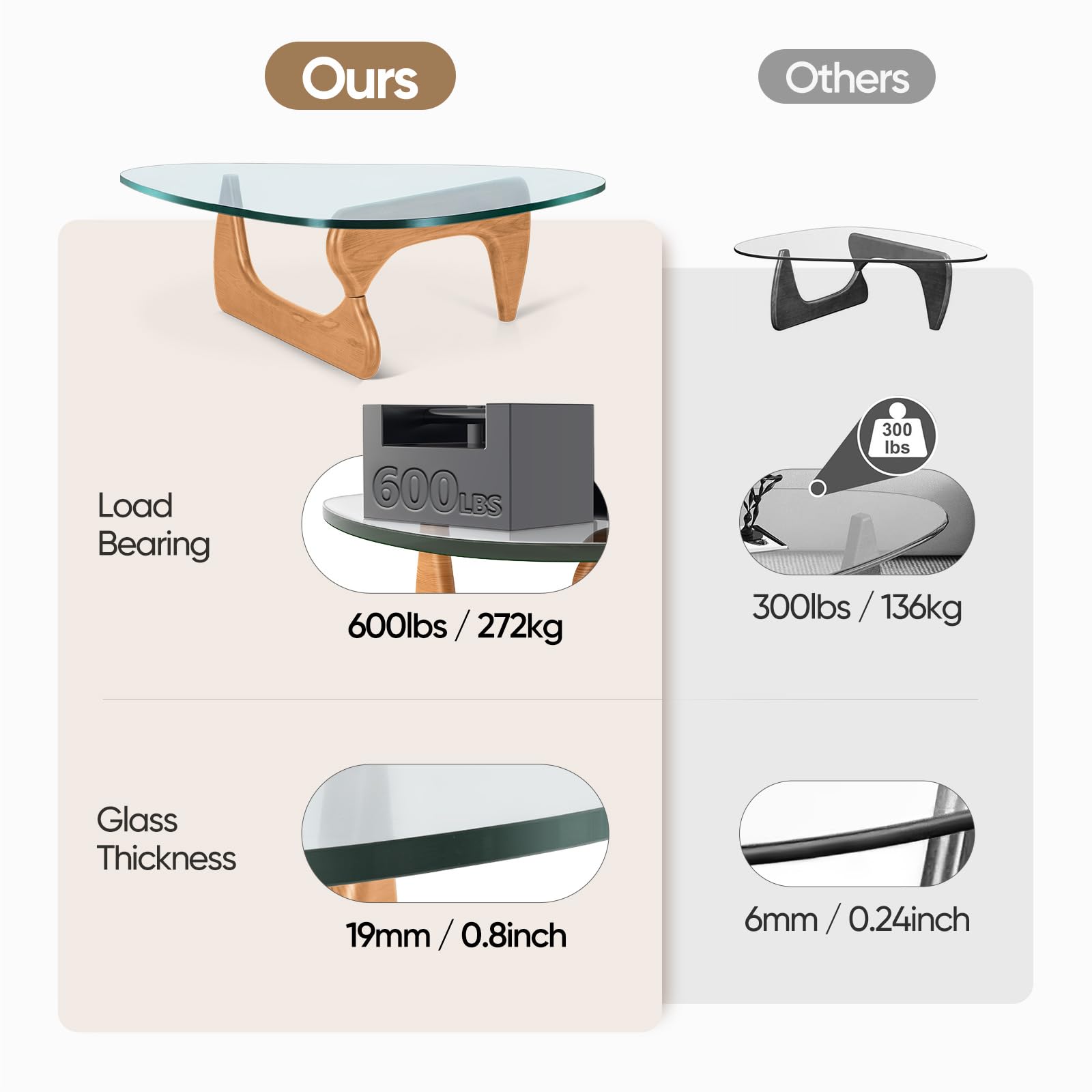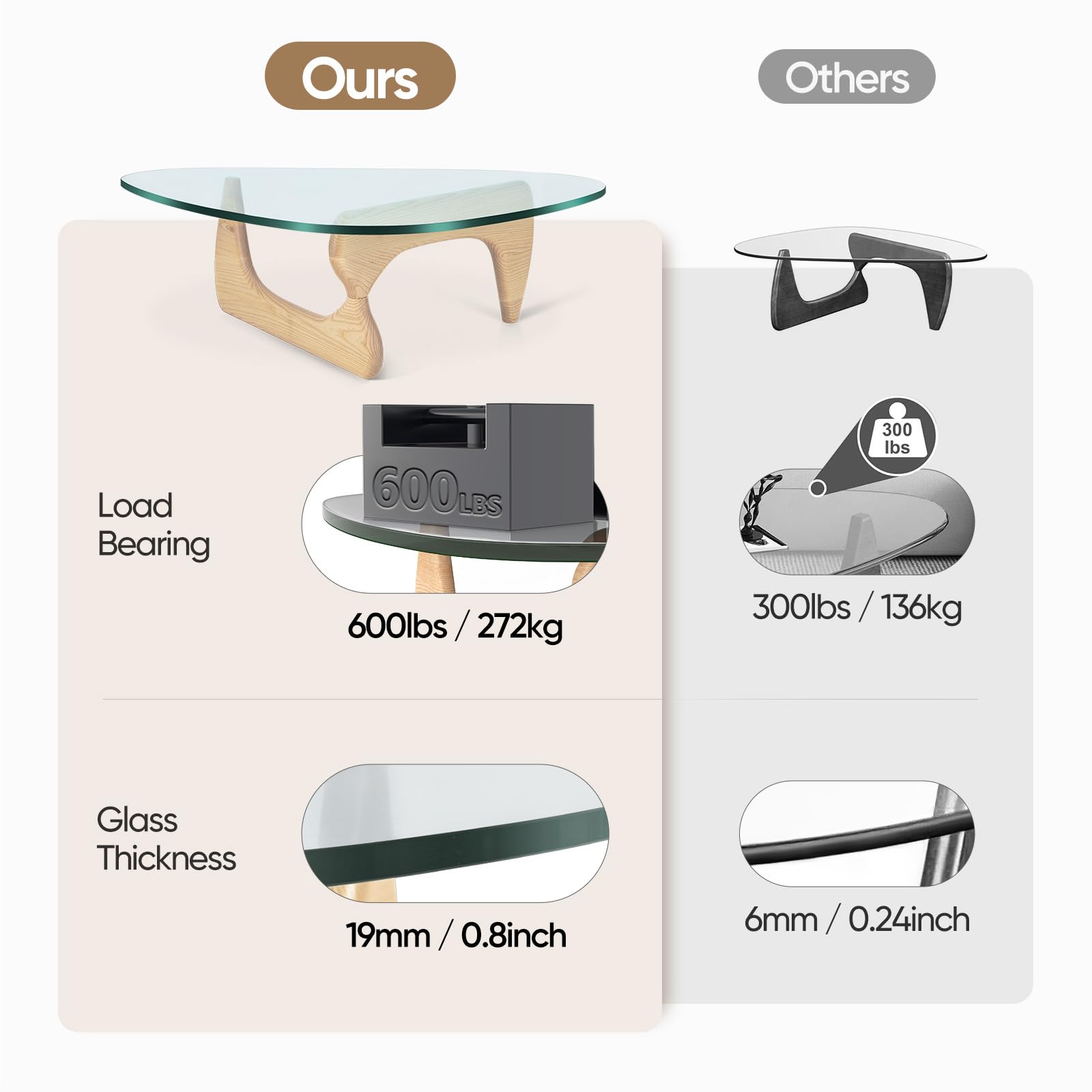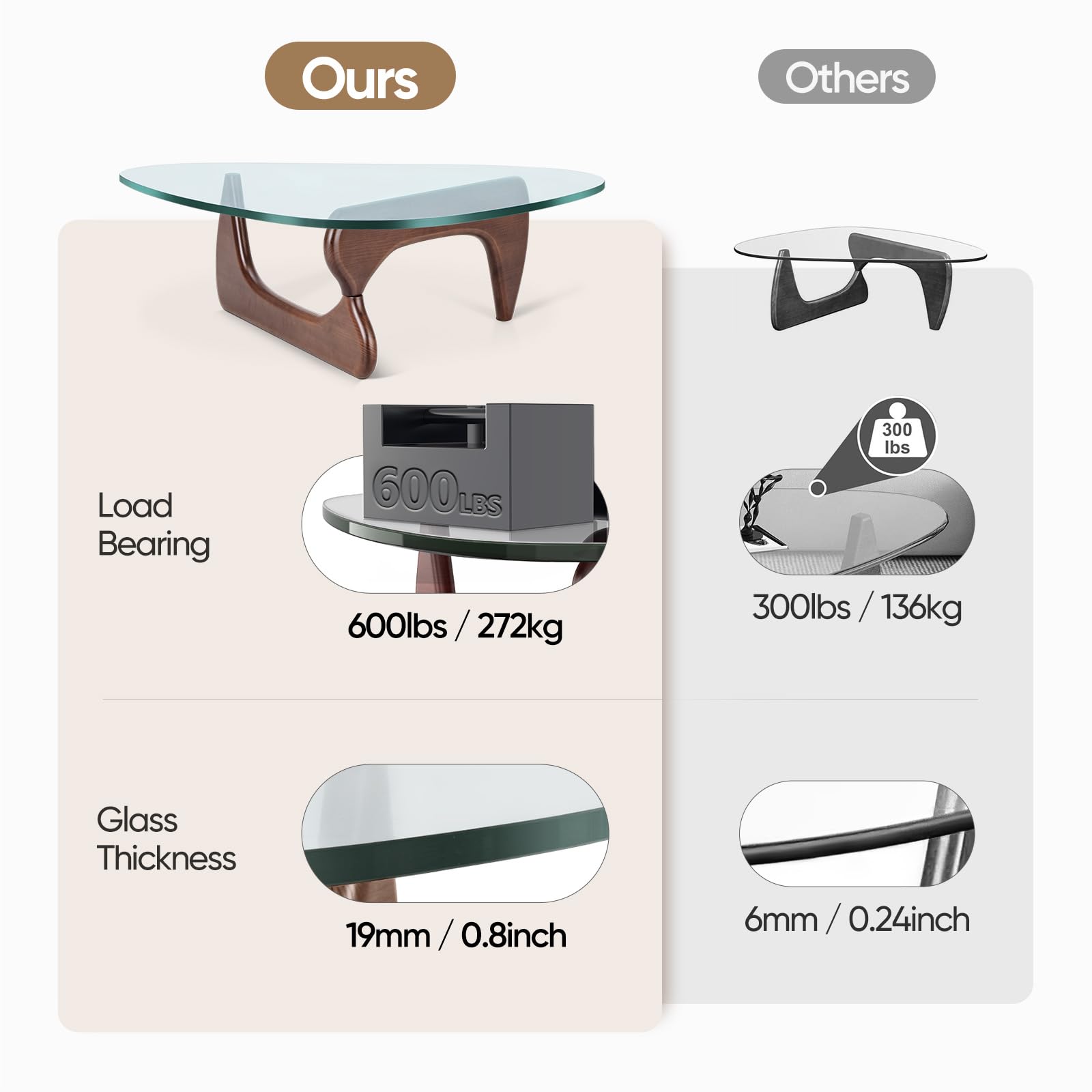 Noguchi Coffee Table – Mid-Century Modern Triangle Glass Coffee Table with Clear Tempered Top & Wood Base, End Table for Living Room Office Hotel Balcony, 50" W x 37.5" D